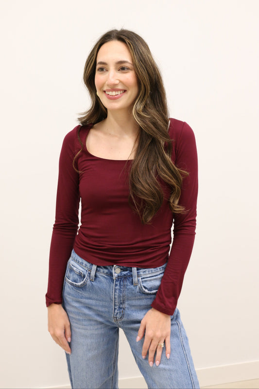 Final Touch Double Layer Square Neck Long Sleeve Knit Top - Burgundy Elderberry