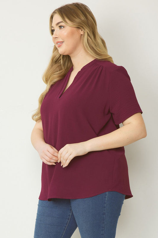 Lydia Curve Essential V-Neck Woven Short Sleeve Blouse - Burgundy