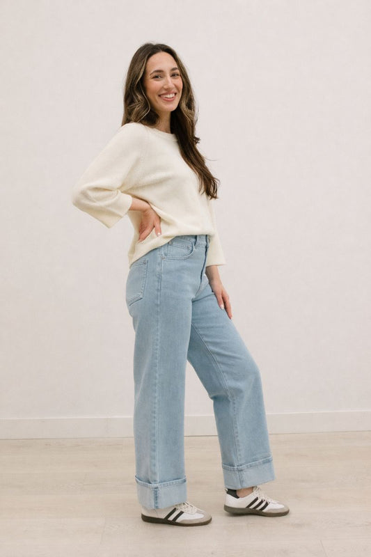 Nataline High Waisted Casual Wide Leg Cuffed Pant - Light Denim
