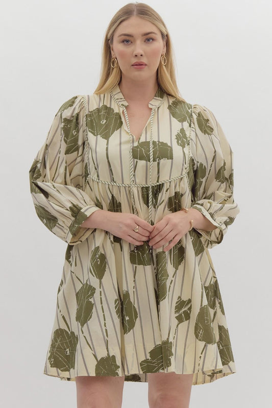 Abbigail Curve Floral Printed V-Neck 3/4 Sleeve Mini Dress - Green Multi