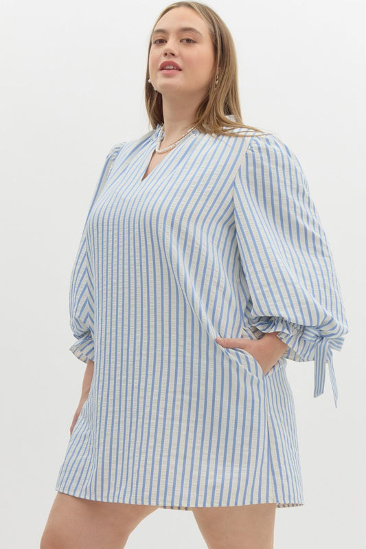 Olivia Curve Striped 3/4 Sleeve Bow Tie Detail Mini Dress - Powder Blue Multi