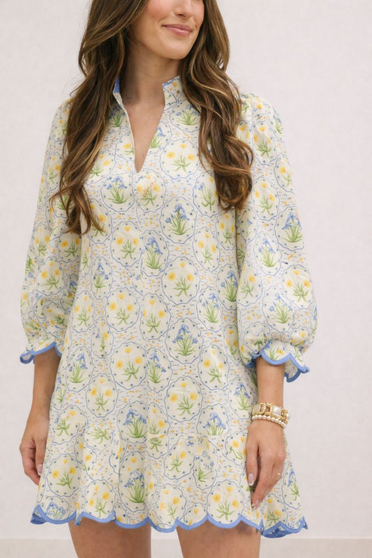 Briar Botanical Floral 3/4 Sleeve Scallop Trim Mini Dress - Blue Multi