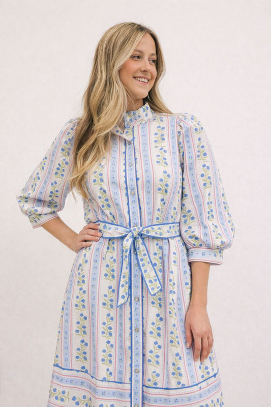 Fleur Floral Stripe 3/4 Sleeve Tie Waist Midi Dress - Blue Multi