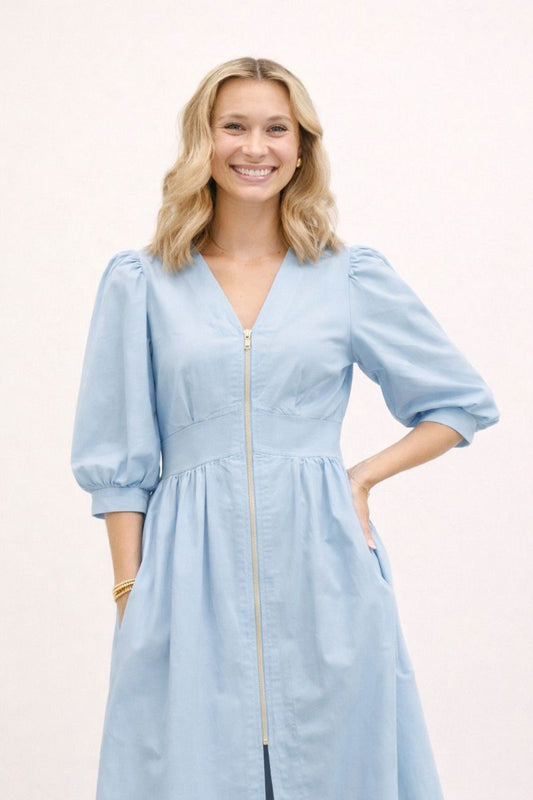 Lorelai 3/4 Sleeve Zip Front Midi Dress - Light Blue