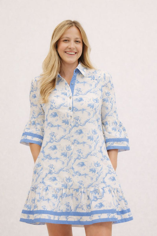 Surrey Toile Print 3/4 Sleeve Mini Dress with Contrast Trim – Blue & White