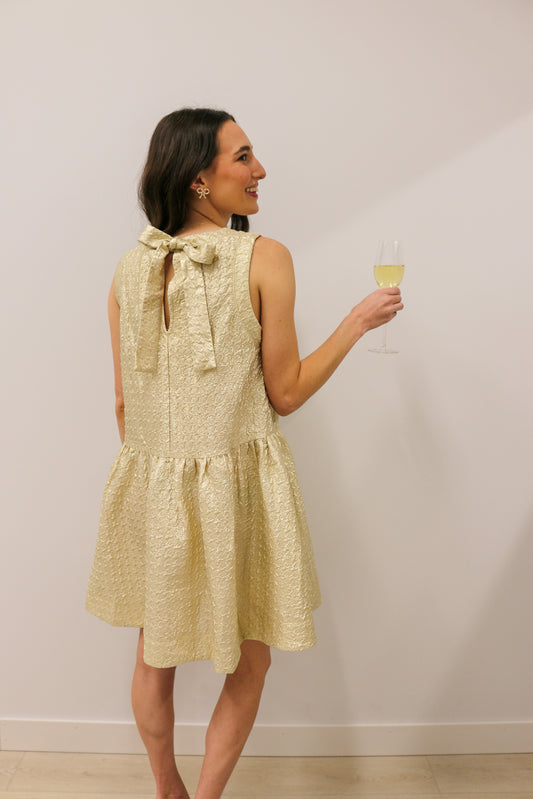 Hepburn Shimmer Textured Drop Waist Bow Tie Back Mini Dress - Champagne
