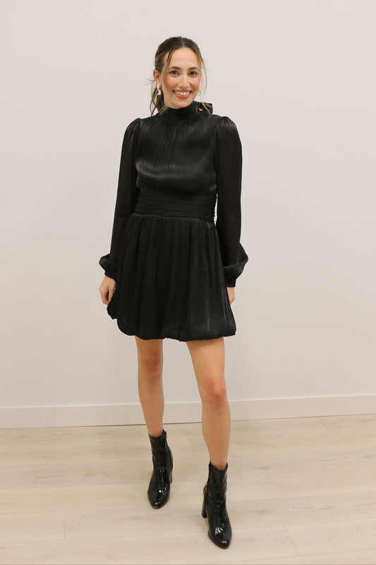 Astra Bow Neck Bubble Hem Long Sleeve Mini Dress - Black