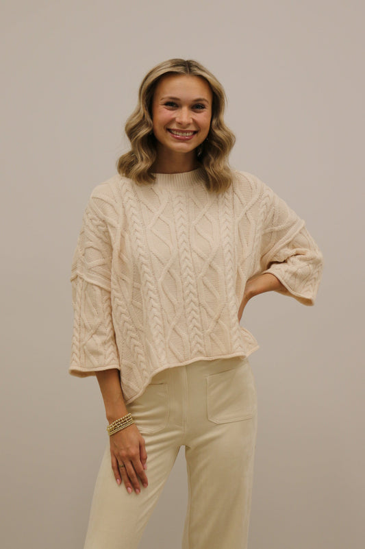Corrin Cable Knit 3/4 Sleeve Knit Pullover Sweater - Cream