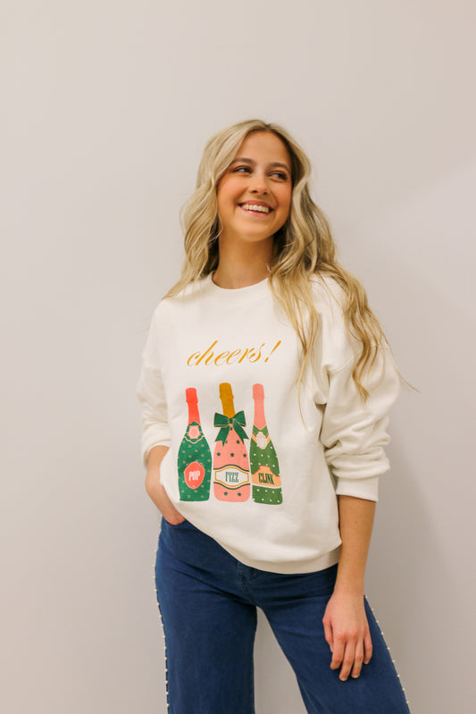Cheers Pop Fizz Clink Champagne Bottles Graphic Crewneck Sweatshirt - White Multi