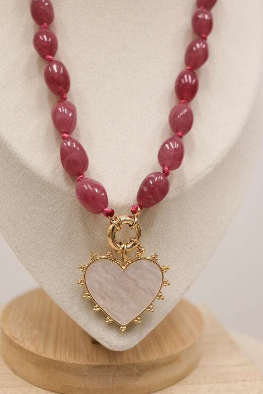 Julia Beaded Natural Stone Heart Pendant Necklace - Pink