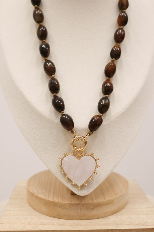 Julia Beaded Natural Stone Heart Pendant Necklace - Brown