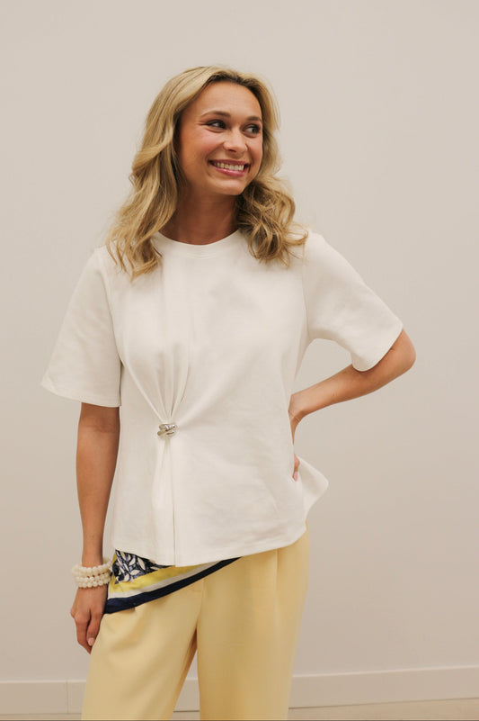 Reina Silver Hardware Gathered Knit Short Sleeve Top - Off White