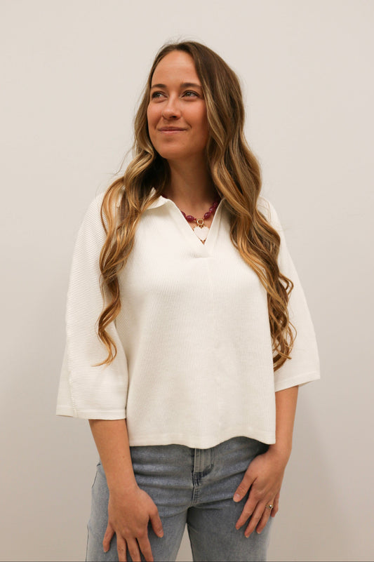 Megan Collared Split Neck Short Sleeve Sweater - Cream