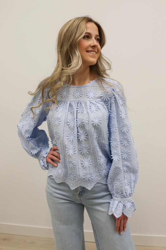 Maise 3D Floral Long Sleeve Woven Scallop Hem Blouse - Light Blue