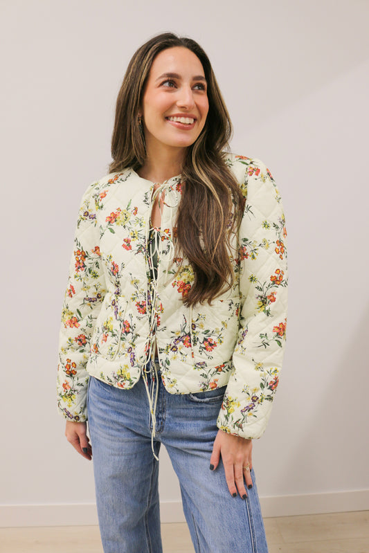 Romance in Bloom Floral Quilted Tie Front Long Sleeve Jacket - Ecru Multi