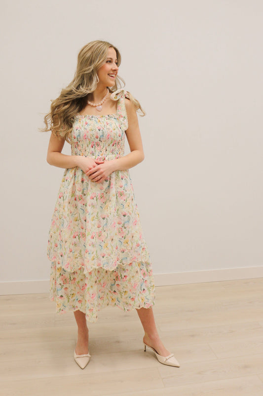 Lisette Embroidered Floral Tie Shoulder Tiered Midi Dress - Pastel Multi