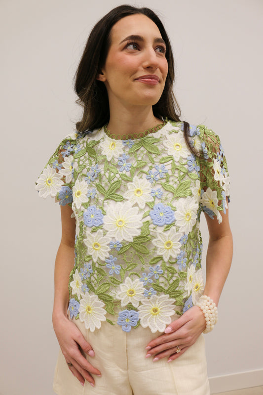 Nicolette Crochet Floral Lace Short Sleeve Statement Blouse - Blue Yellow Multi