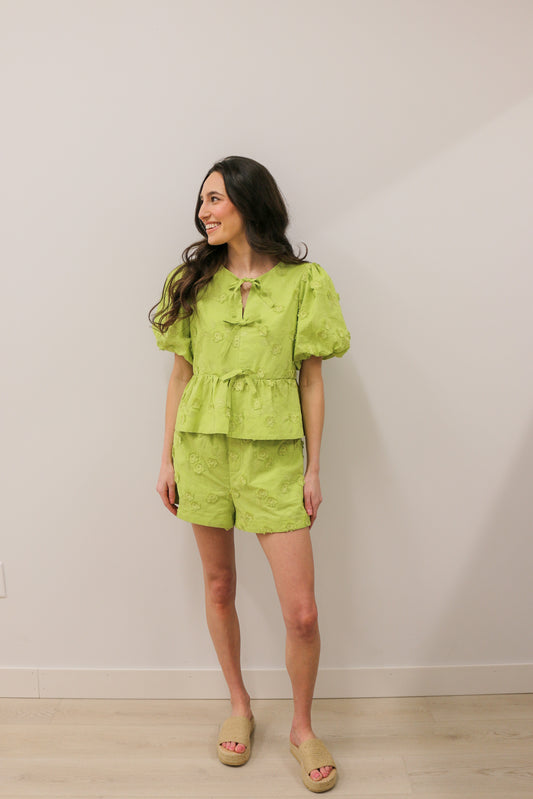 Embroidered Floral Appliqué Front Tie Closure Bubble Short Sleeve Blouse - Apple Green