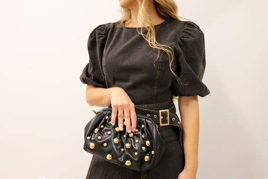 Carey Gold Studded Leather Clutch with Chain - Black