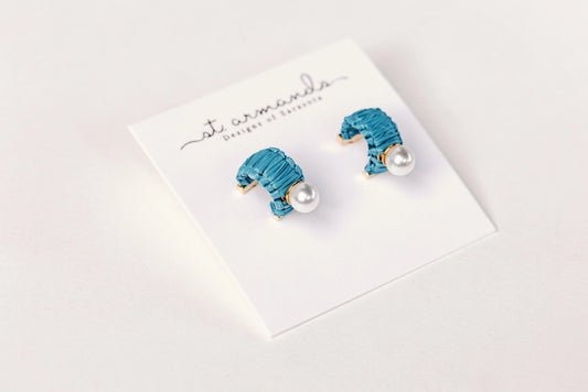 Mini Raffia and Pearl Huggie Hoop Earrings - Cornflower Blue