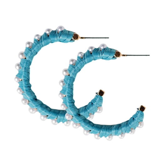 Studded Pearl Raffia Statement Hoop Earrings - Cornflower Blue