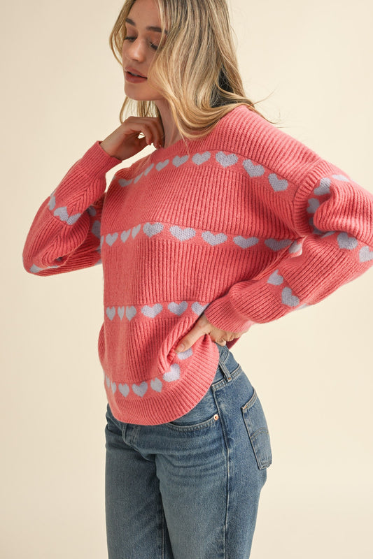 Petite Heart Valentine Long Sleeve Ribbed Detail Sweater - French Pink
