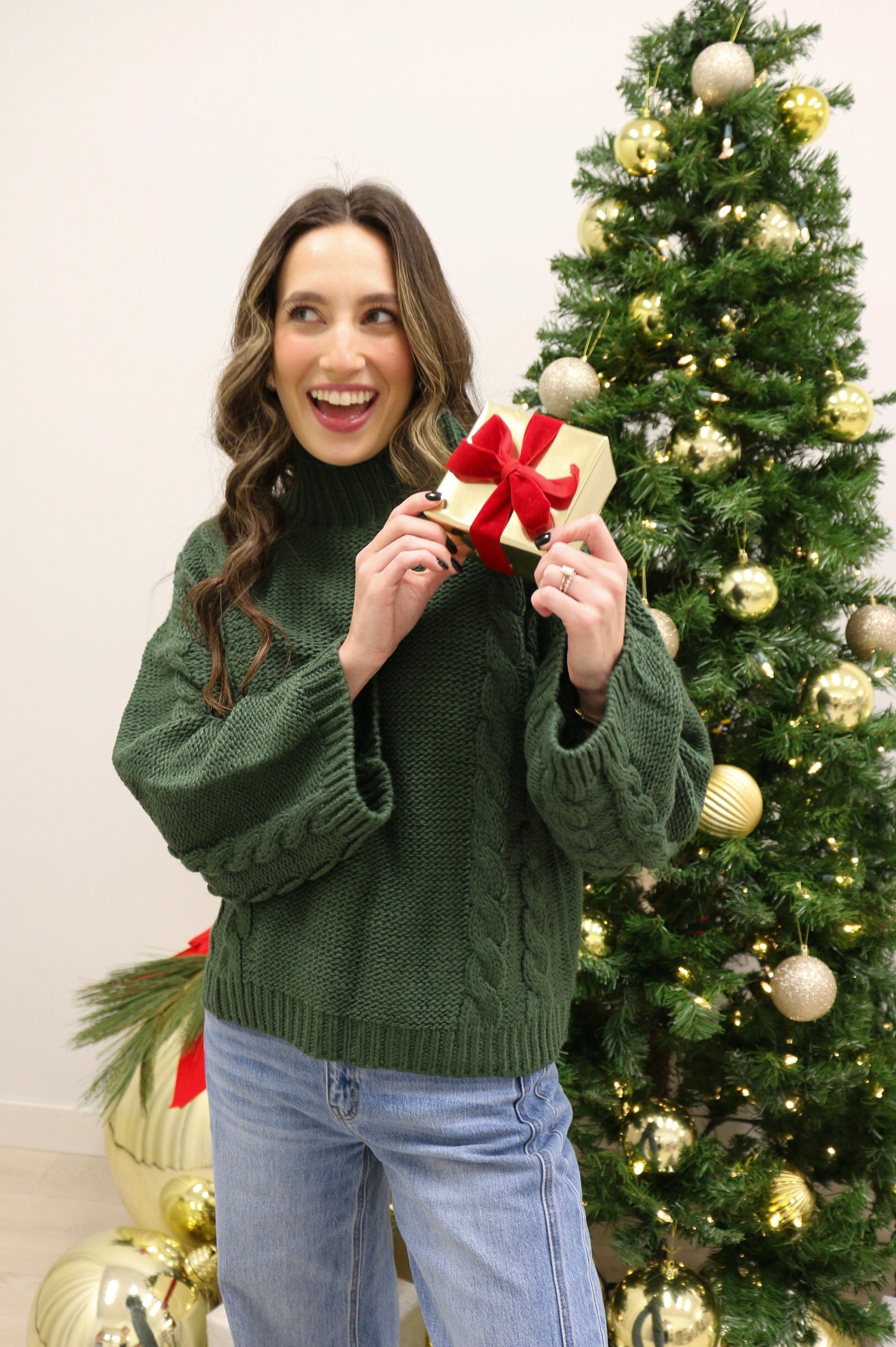 Cozy, classic, and effortlessly chic, the Alpine Oversized High Neck Cable Knit Sweater is a winter wardrobe essential. Crafted in a rich hunter green hue, this sweater features a timeless cable knit pattern and a high neck for extra warmth and style.