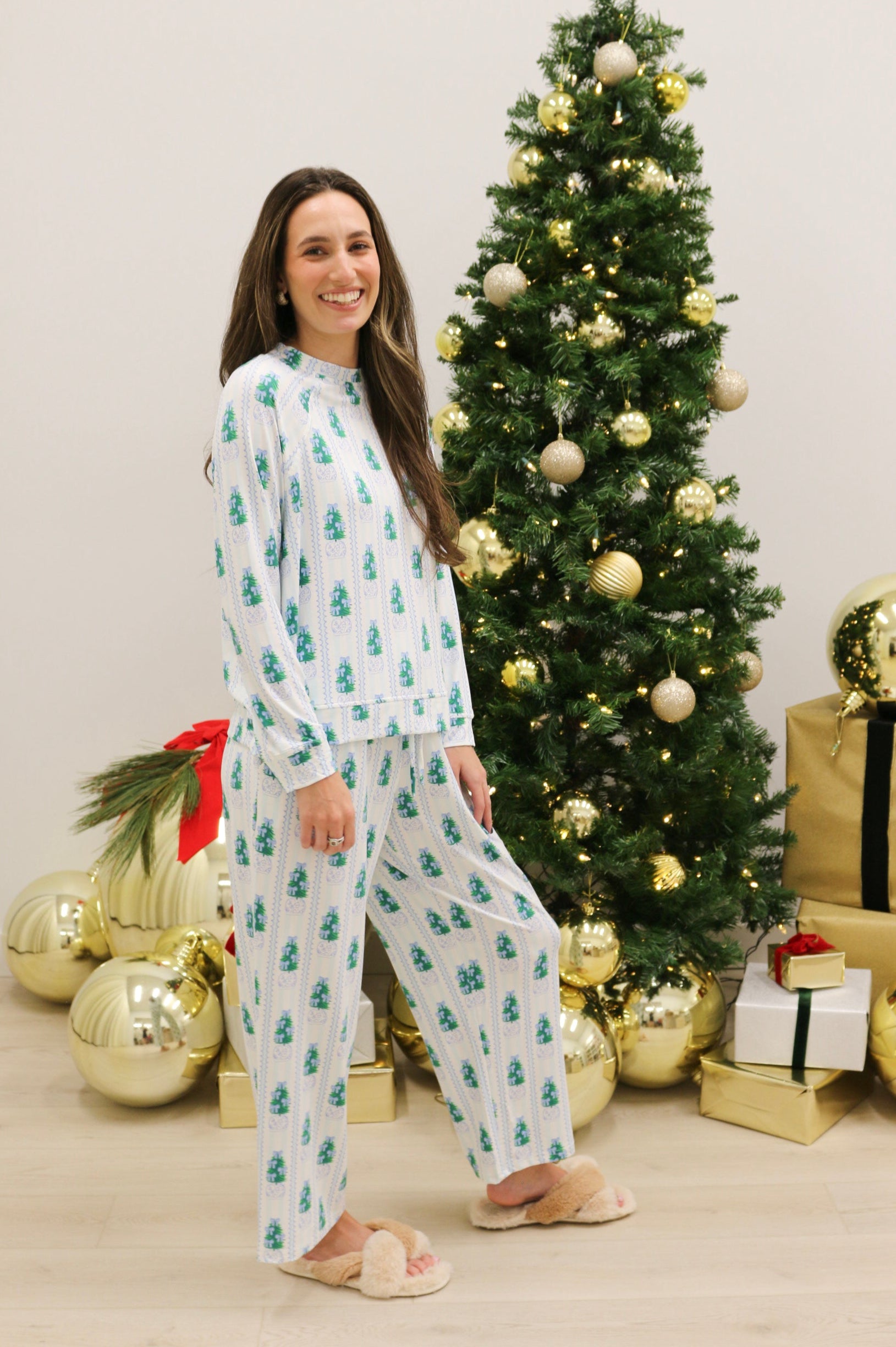 Celebrate the season in timeless style with the Annie Ginger Jar Joy Pajama Set. Featuring elegant Christmas trees nestled in classic blue-and-white ginger jars and adorned with soft blue bows, this charming print sits atop a soft blue stripe background for a festive yet sophisticated holiday look. The cozy long sleeve top pairs with straight-leg pants designed for all-night comfort, complete with a stretchy elastic waistband, adjustable drawstring, and functional pockets.
