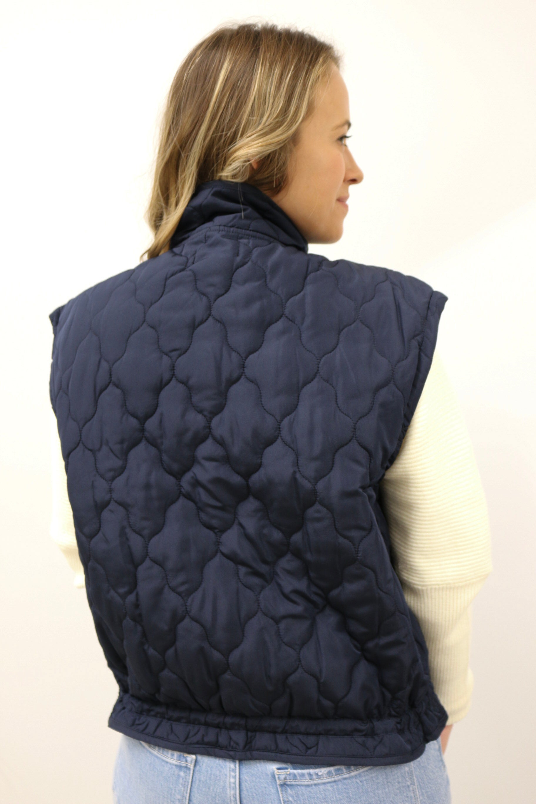 Aven Tie Detail Snap Button Down Quilted Puffer Vest – Navy Blue