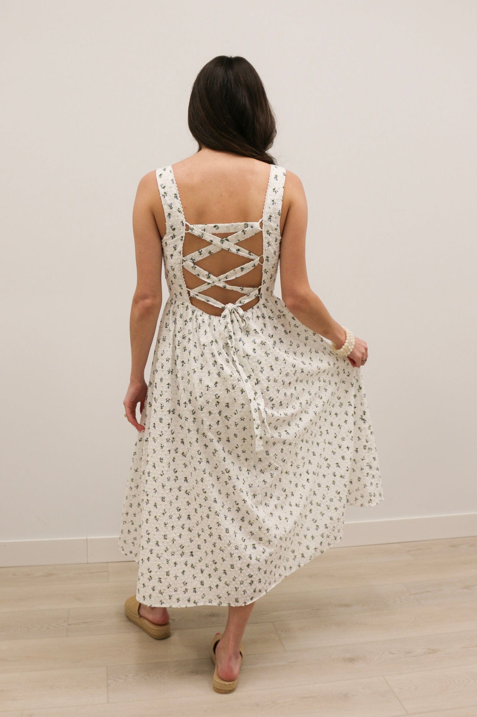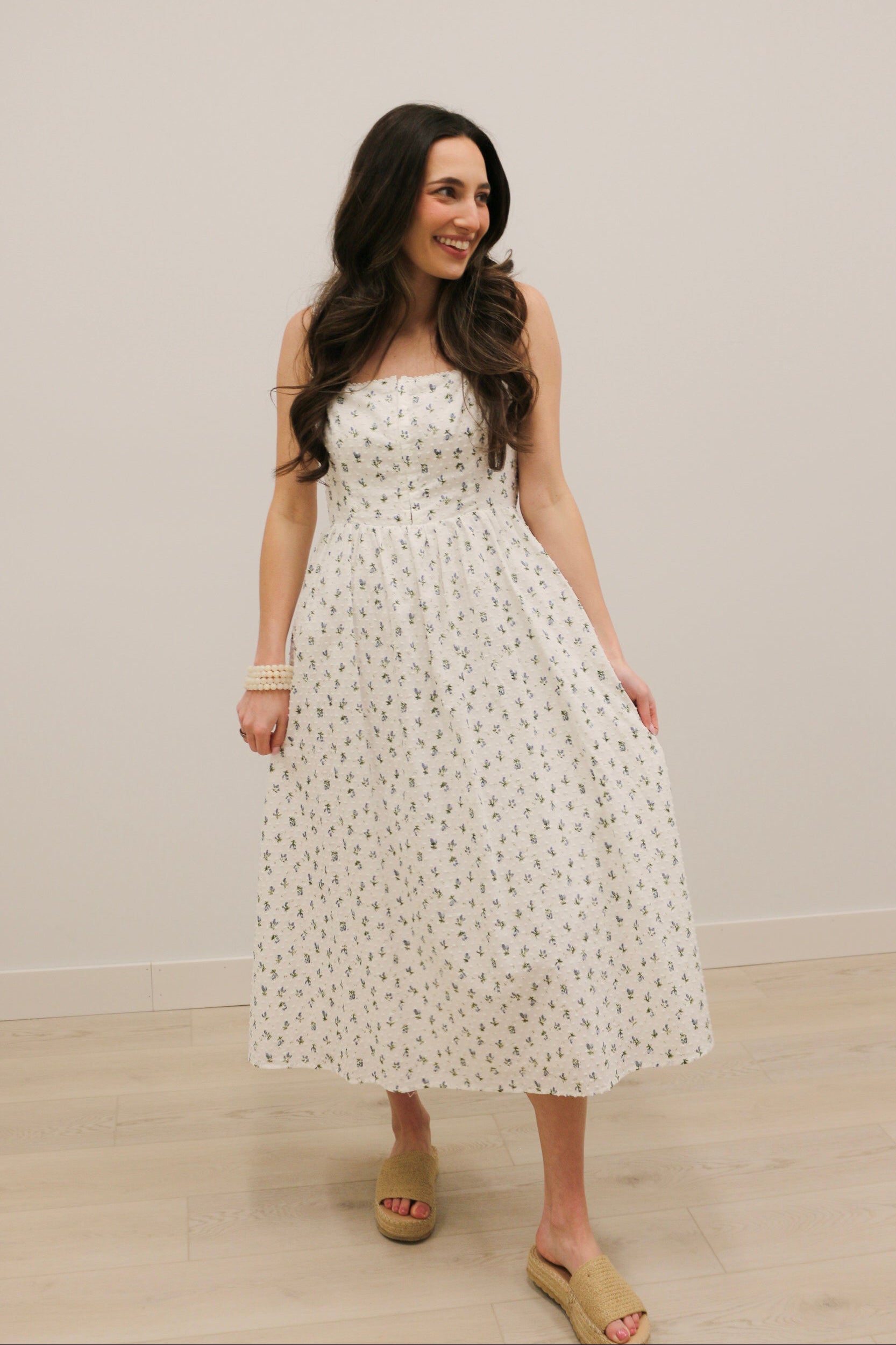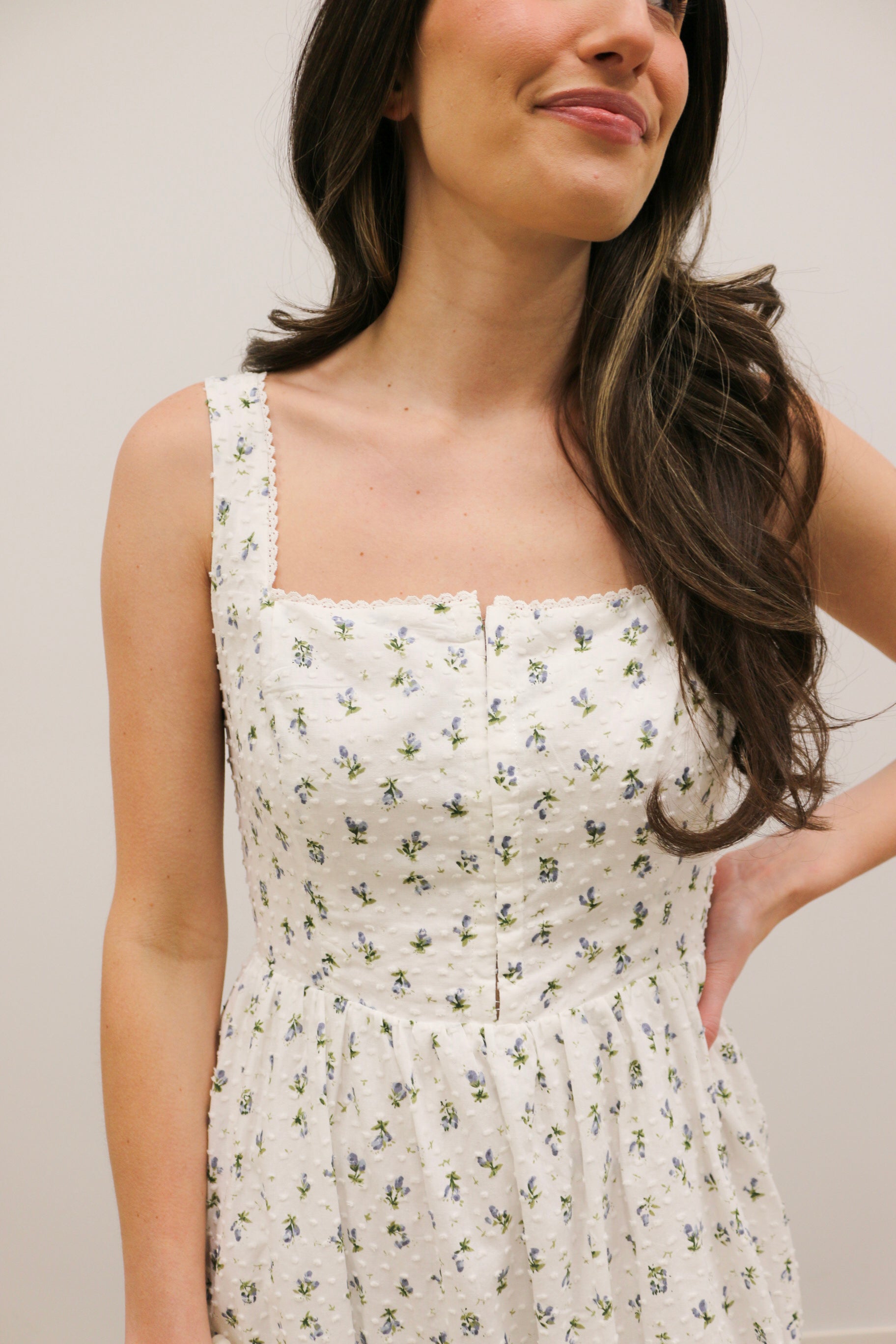 The Avielle Ditzy Floral Clip Dot Corset Tie Midi Dress captures romantic, vintage-inspired charm with a modern silhouette. Designed on a soft white base with a delicate blue and green ditzy floral print, this dress features textured clip dot fabric for added dimension. The structured bodice with light corset boning and a hook-and-eye front closure creates a flattering shape, while the adjustable tie detail at the back and elasticized waist ensure the perfect fit. With its flowing midi length and soft, feminine details, this dress gives off effortless Bridgerton-inspired elegance- perfect for spring and summer occasions.