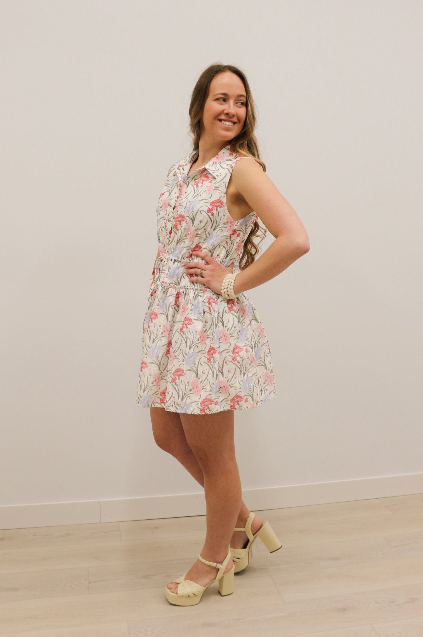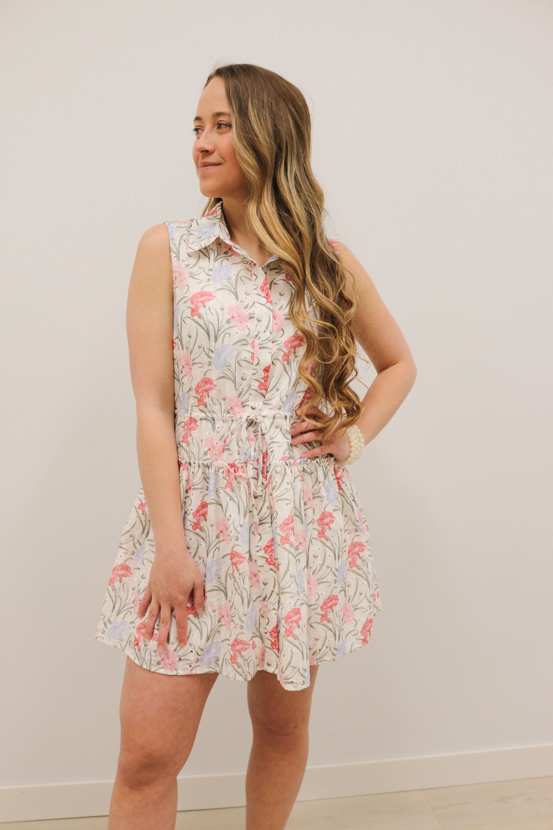 The Evianna Embroidered Floral Print Collared Fit and Flare Mini Dress blends classic structure with soft, feminine details. Designed on an ivory base with a delicate pink and lavender floral print, this dress features beautiful embroidered detailing throughout for added texture and dimension. The collared neckline and button-front bodice give it a polished touch, while the drawstring waist and fit-and-flare silhouette create a flattering, easy shape. Finished with soft seam detailing at the hips and a fully lined design, this charming mini dress is perfect for everything from brunch to warm-weather outings.