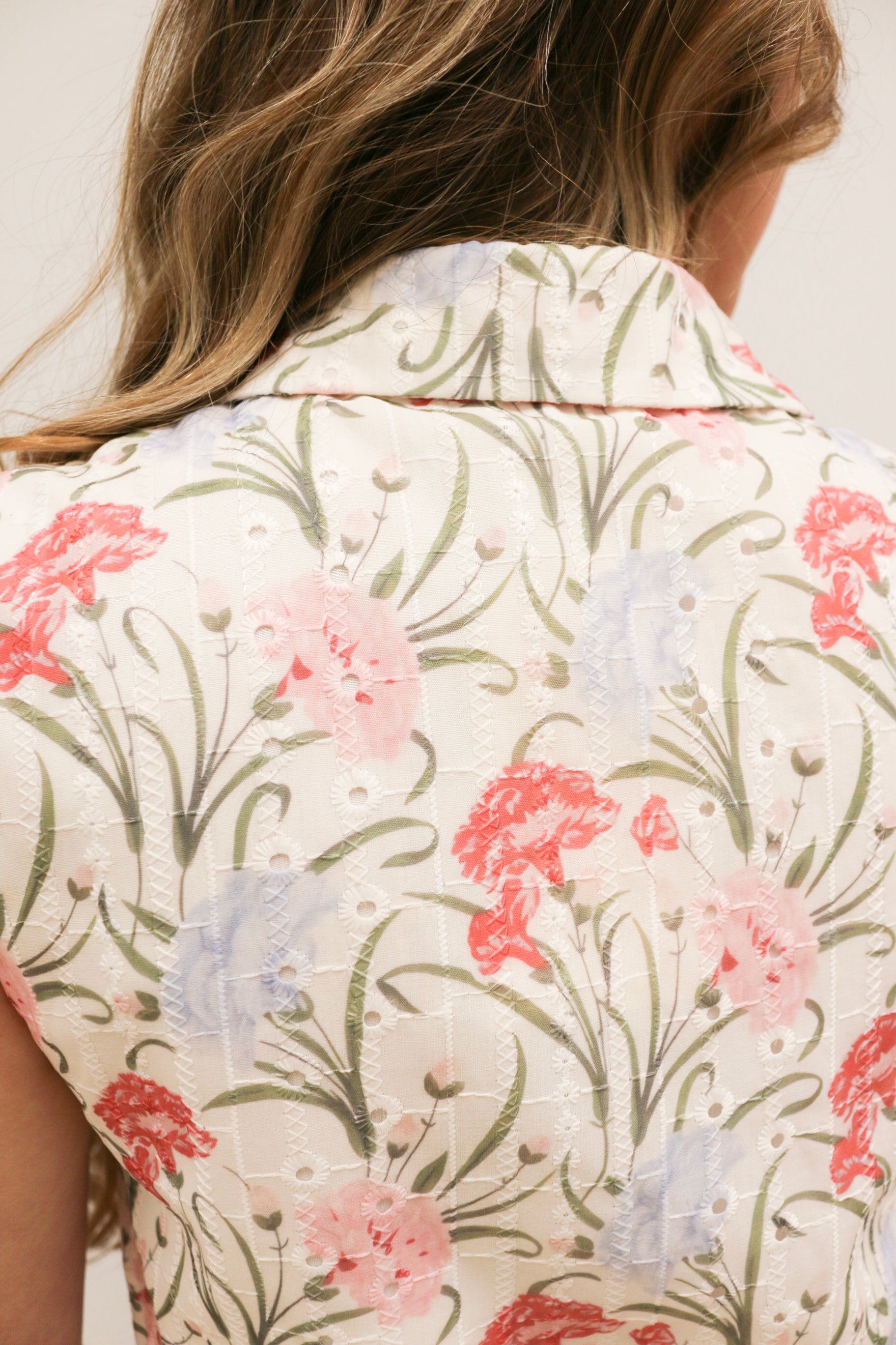Embroidered floral fabric adds beautiful texture and detail