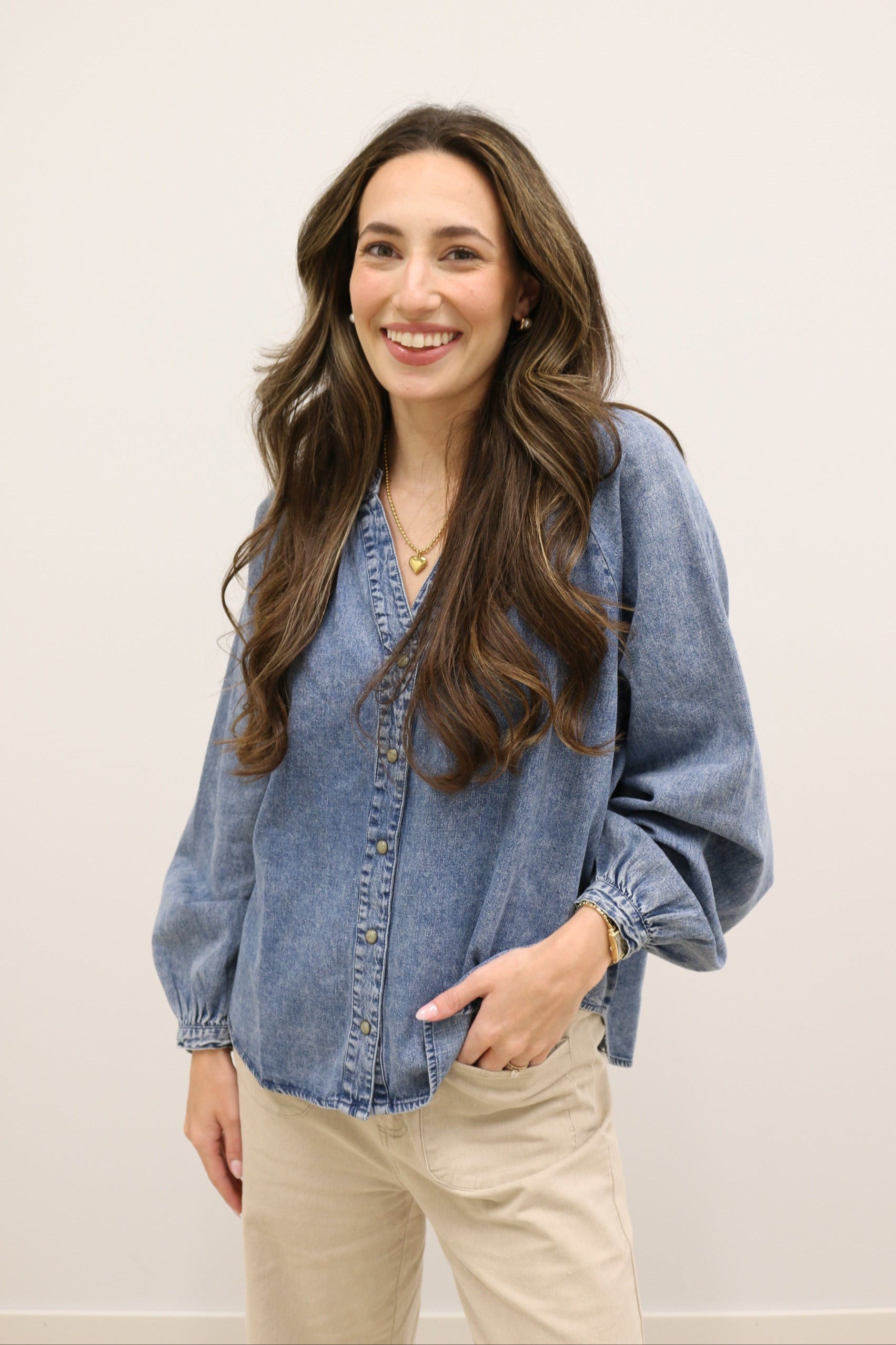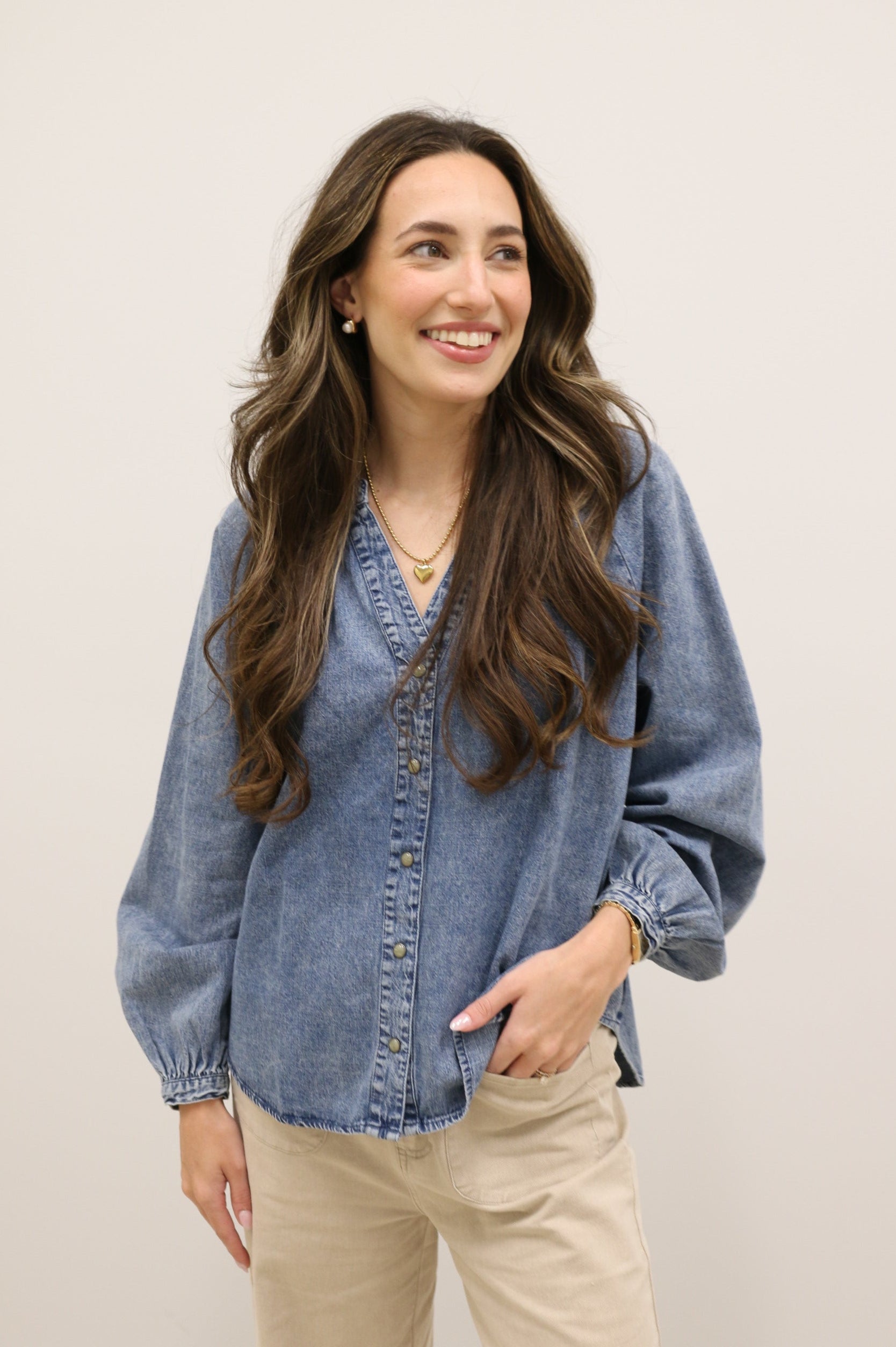 West Long Sleeve Button Down V-Neck Denim Blouse - Denim