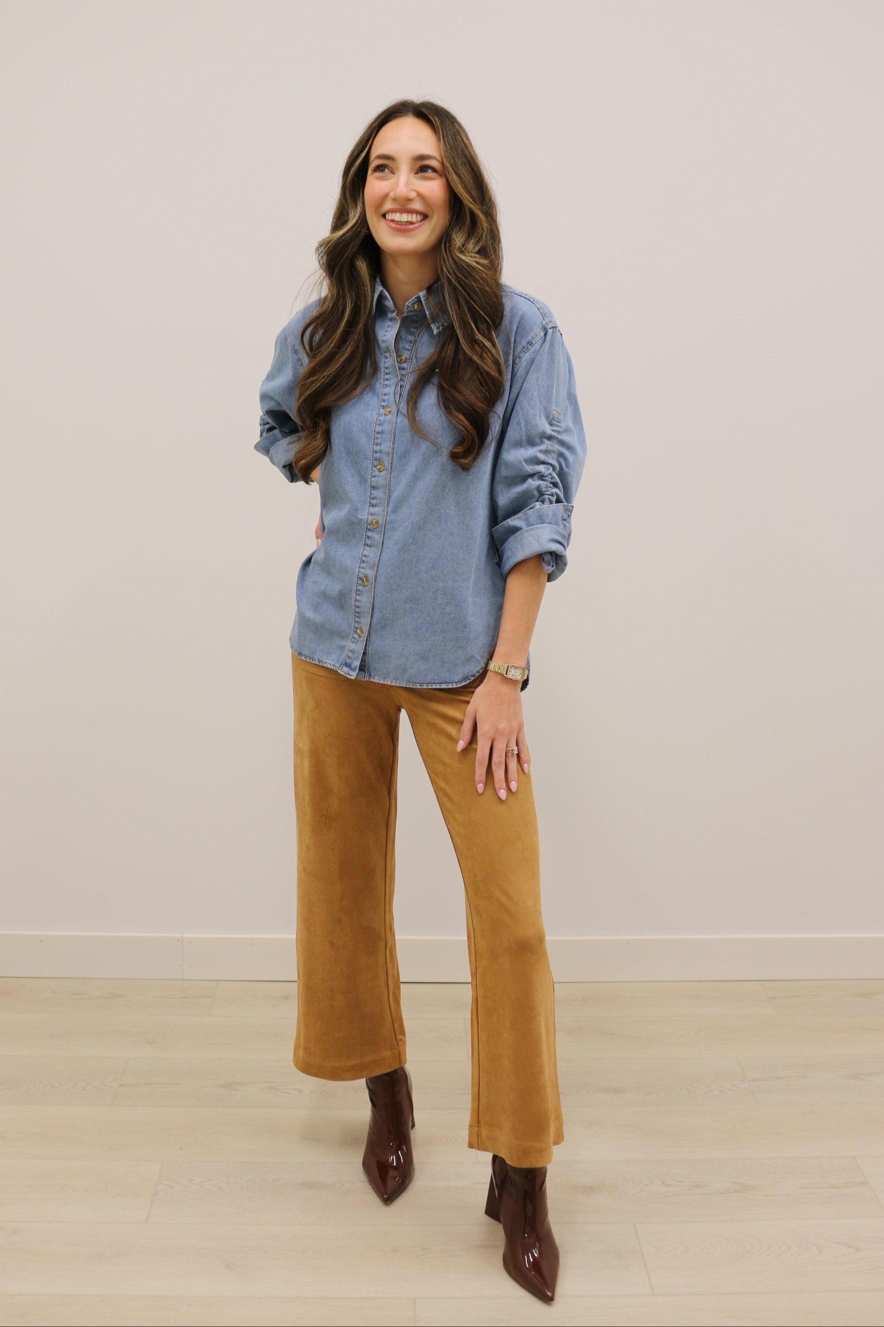 Slip into sophistication with our elevated Lana high-waisted pants - where classic tailoring meets modern edge. Crafted from luxuriously soft faux suede, these wide-leg beauties flatter your silhouette while offering all-day comfort. The high-rise waist cinches just right, elongating the legs and enhancing your shape with an effortlessly refined flow.