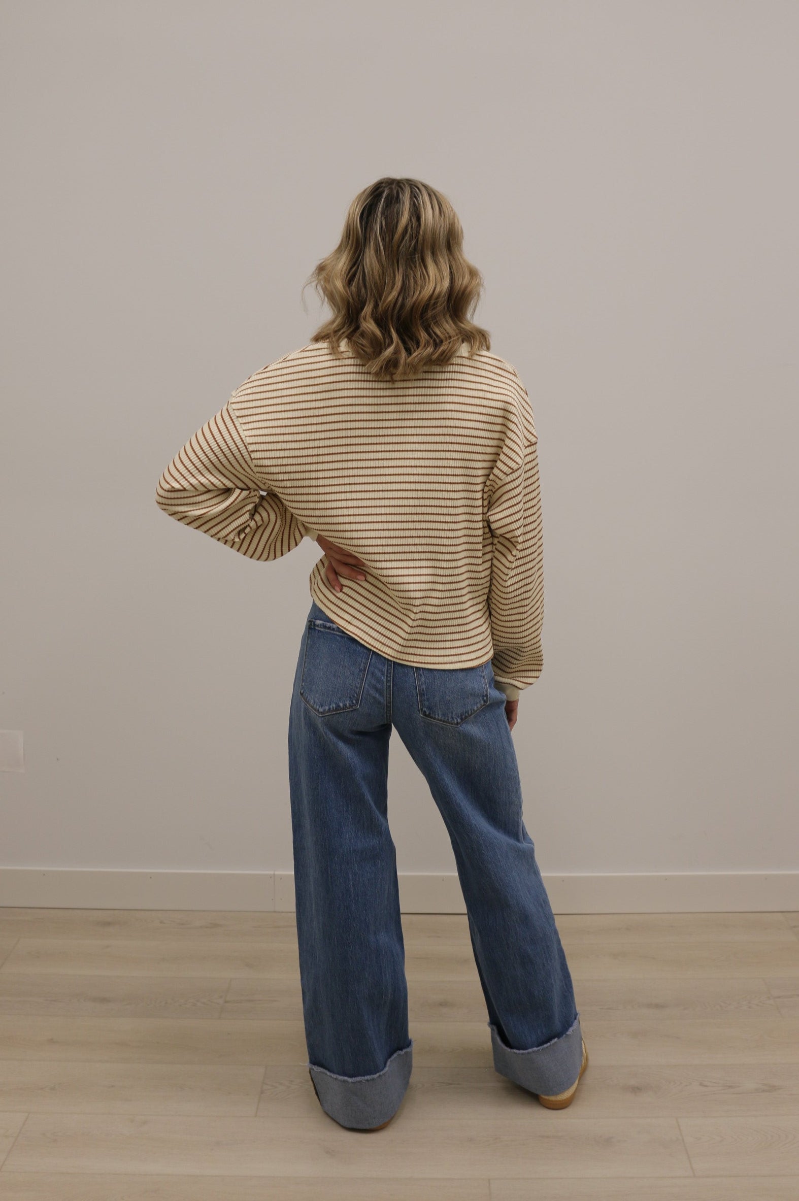 Leisure Stripe Ribbed Crewneck Long Sleeve Knit Top - Cream Brown