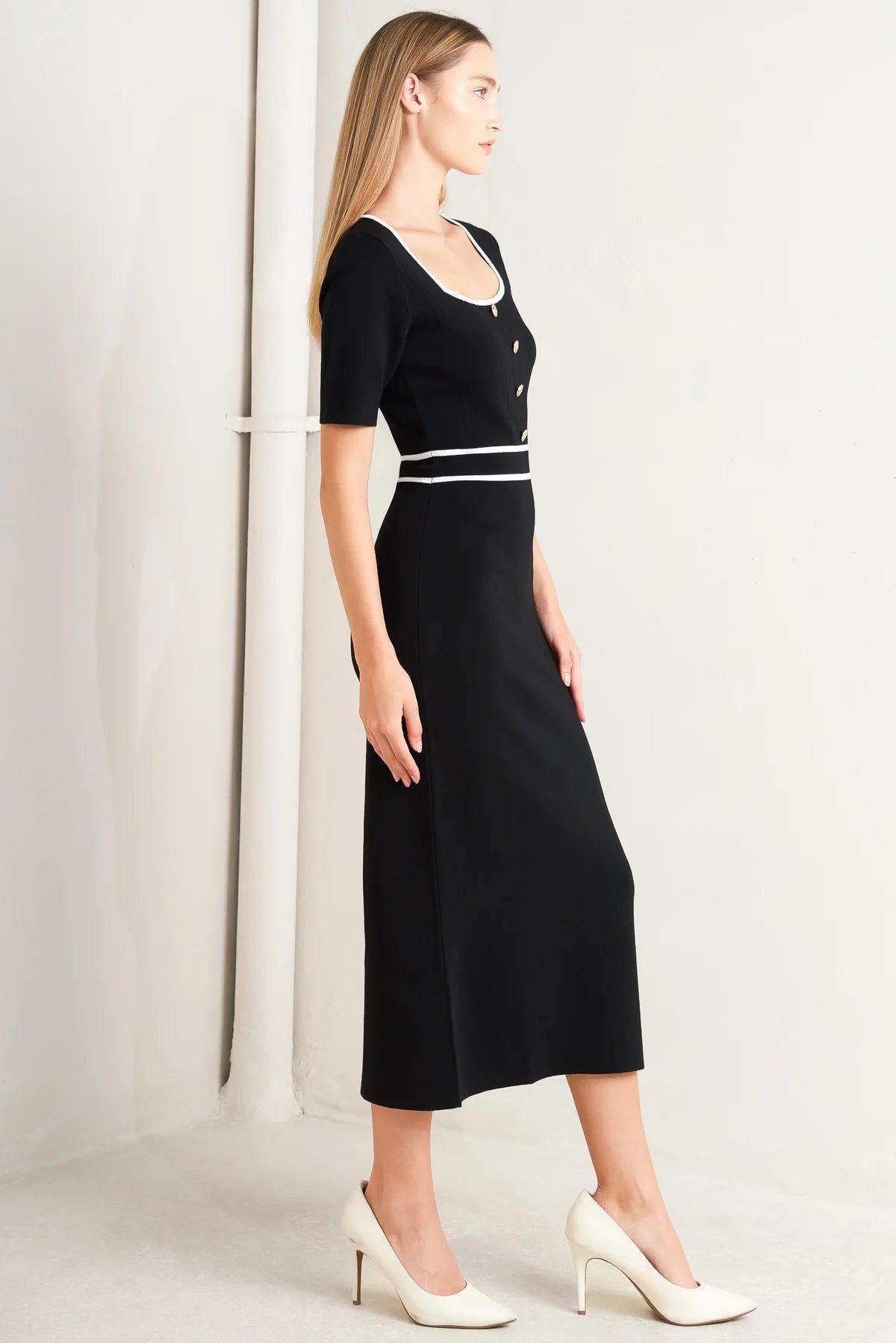 Step into timeless elegance with this beautifully crafted sweater-knit midi dress. Designed with a striking square neckline and a sleek bodycon silhouette, it offers a refined, feminine look that feels both modern and classic. The solid black knit is elevated with crisp white trim at the neckline and waist, while gold faux button accents add a touch of sophistication. A subtle corset-inspired knit detail enhances the shape, and the back slit ensures ease of movement. Perfect for dinners, events, or polished workwear, this dress delivers effortless style with every wear.