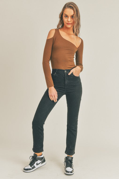 Camine Long Sleeve One Shoulder Cutout Bodysuit - Chocolate Brown