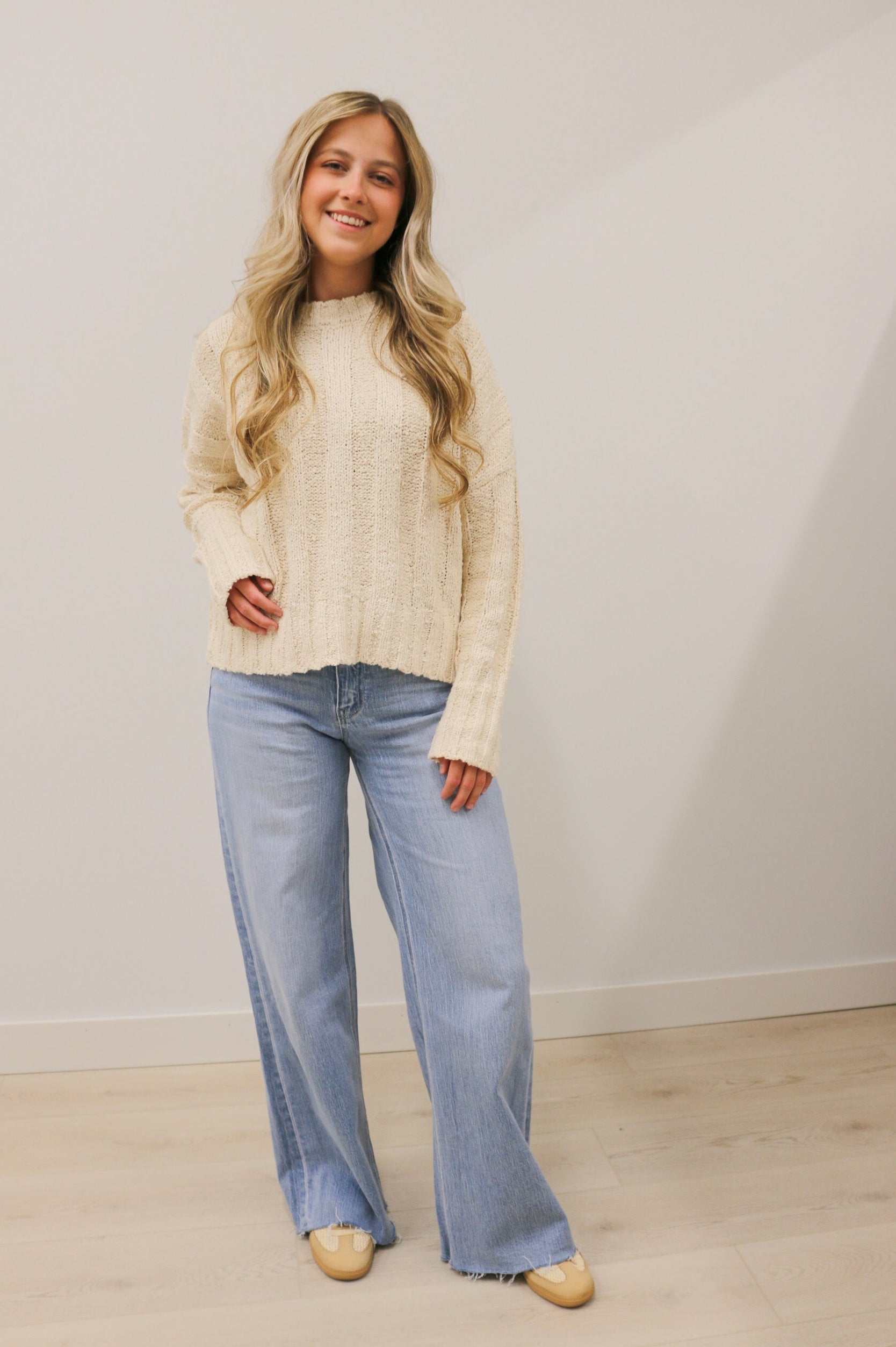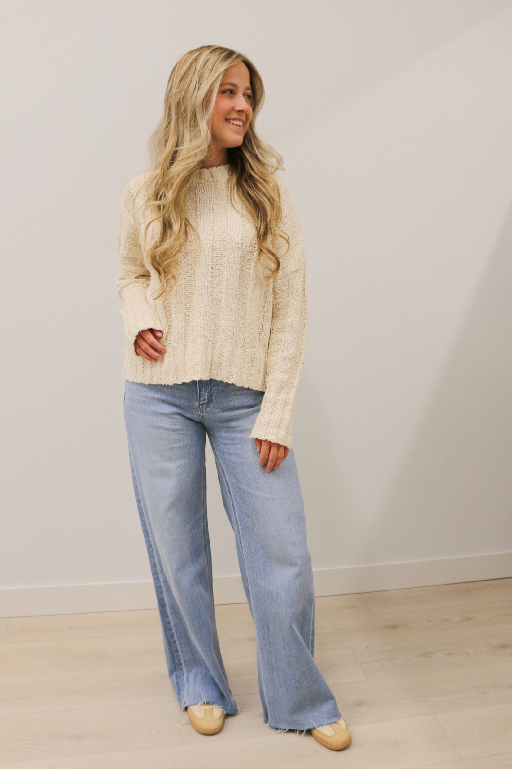 Lume Wide Ribbed Long Sleeve Crewneck Knit Sweater Pullover - Natural
