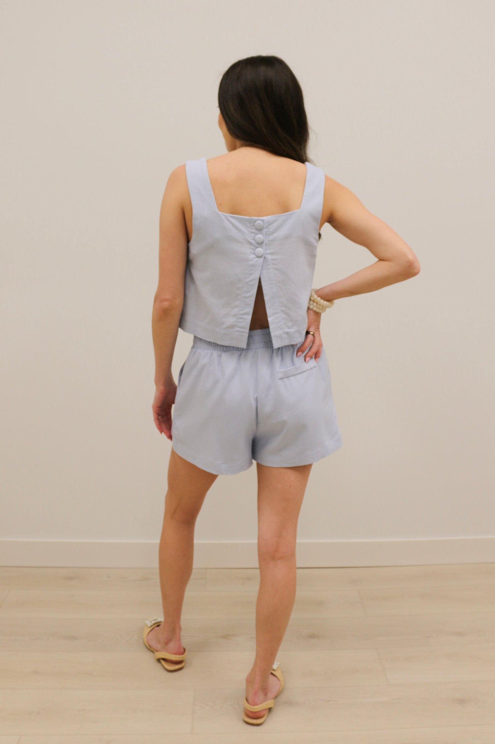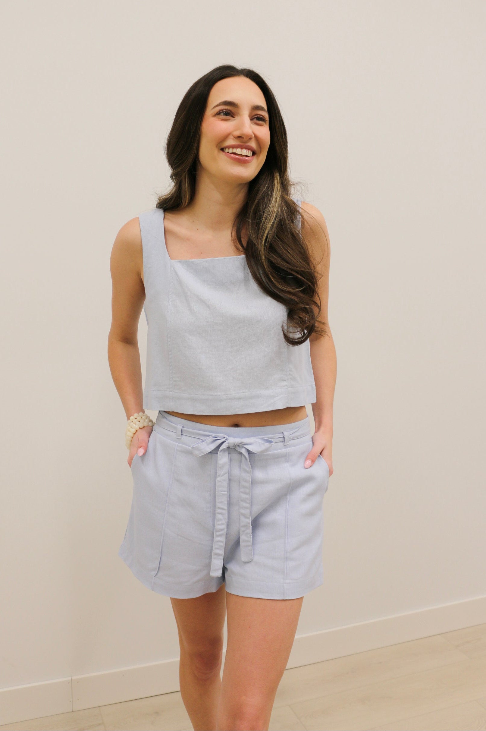The Marianna High Waisted Tie Front Relaxed Woven Shorts are the perfect blend of comfort and effortless polish. Designed in a soft light blue hue with a lightweight linen-like fabric, these shorts feature a flattering high-waisted silhouette and relaxed fit that’s ideal for warm days. The self-tie belt detail and front seam accents add subtle structure, while the elasticized back waistband ensures a comfortable, flexible fit. Pair them with the matching top for a chic coordinated look or style with your favorite tanks and blouses for easy summer outfits.
