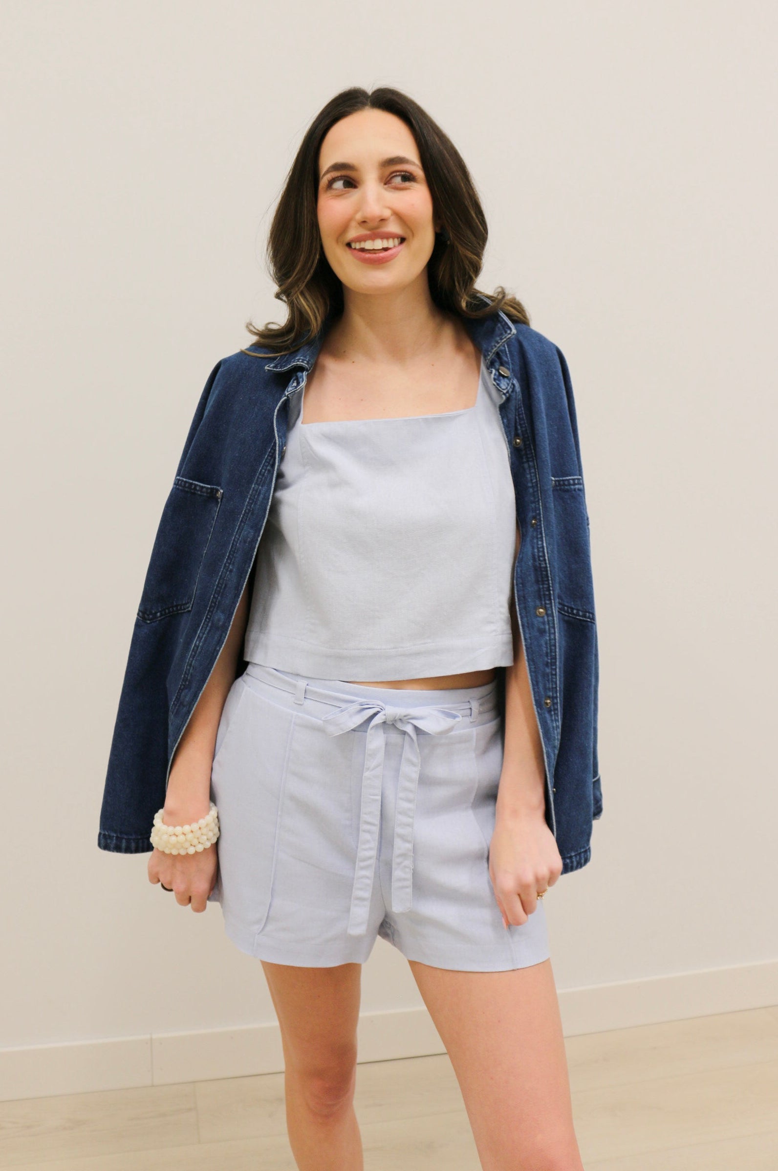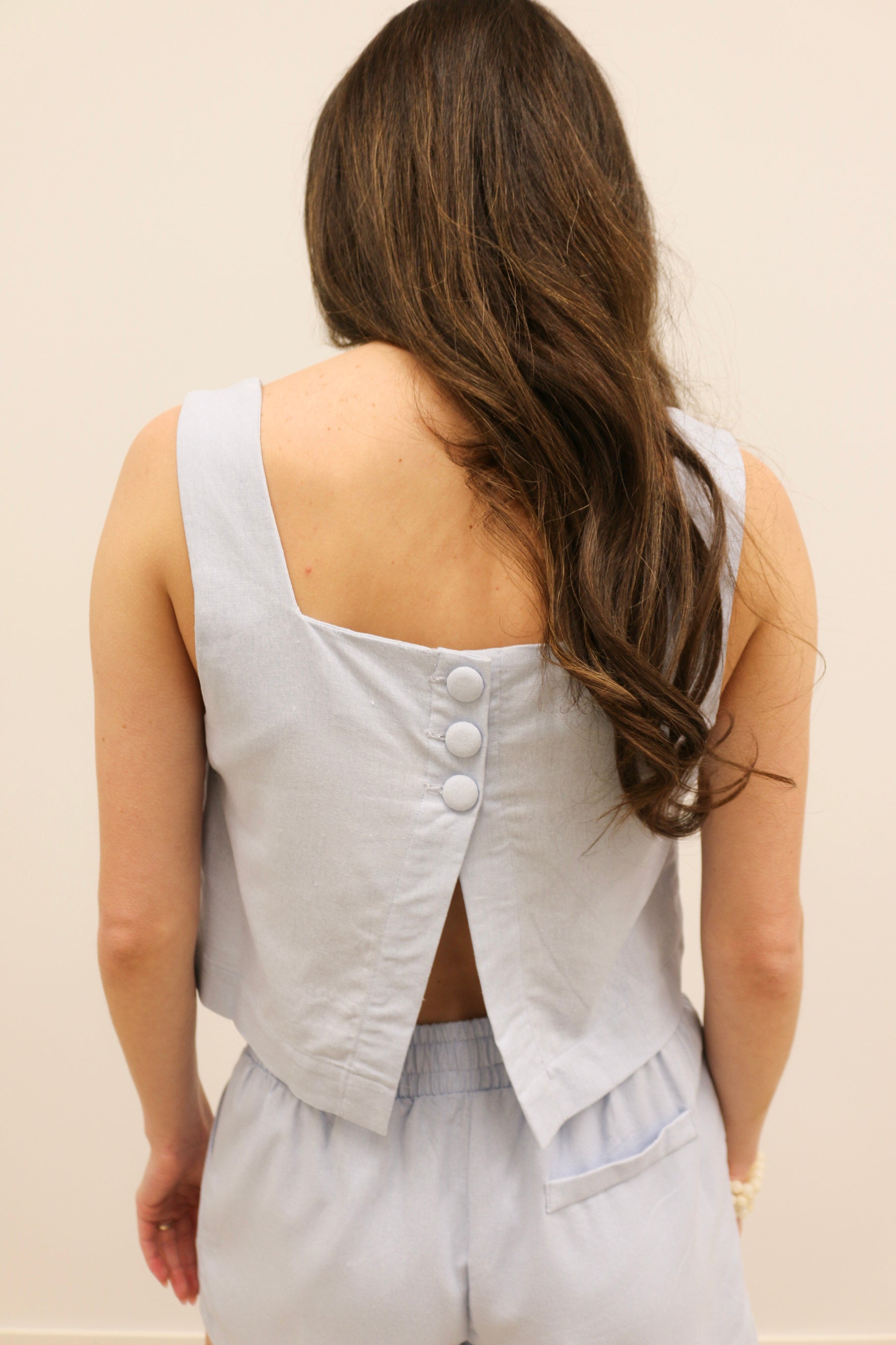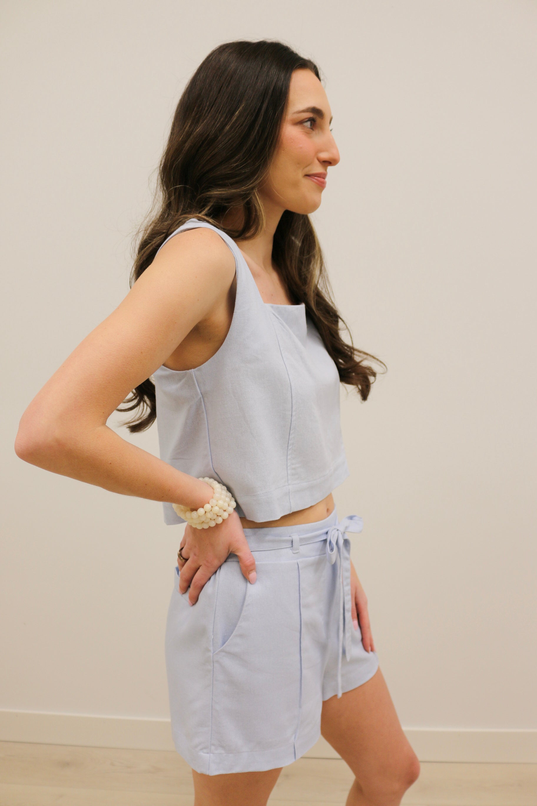 The Marianna Sleeveless Cropped Top is a fresh, modern piece designed for effortless warm-weather styling. Crafted in a soft light blue linen-like fabric, this top features a clean square neckline and matching square back for a sleek, flattering silhouette. The cropped length pairs perfectly with high-waisted bottoms, while the back button detail and subtle slit add a thoughtful finishing touch. Light, breezy, and versatile, it’s the perfect top to wear with the matching Marianna shorts or style with denim or skirts for easy summer outfits.
