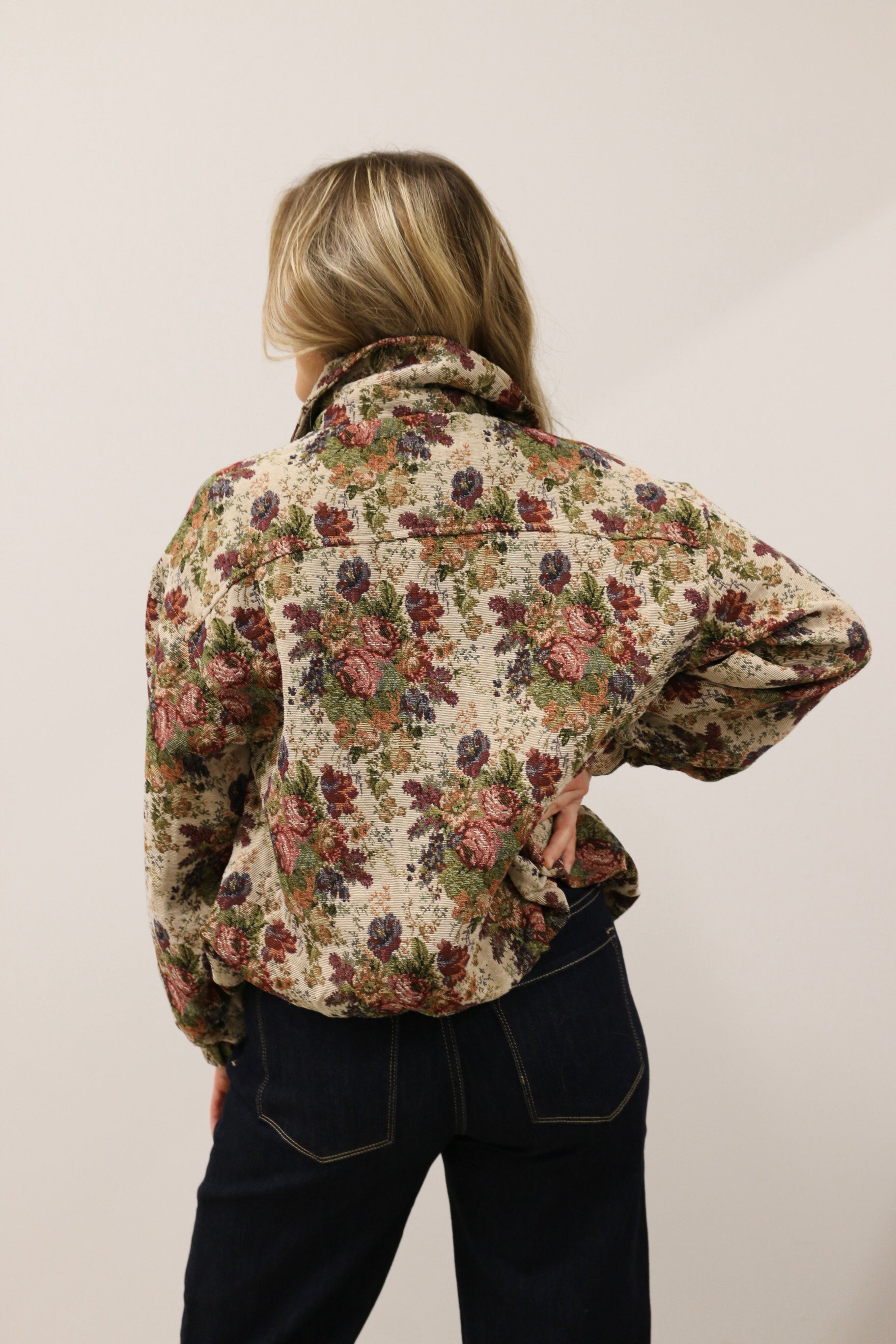 Floral jacquard bomber jacket with tapestry-inspired rose design