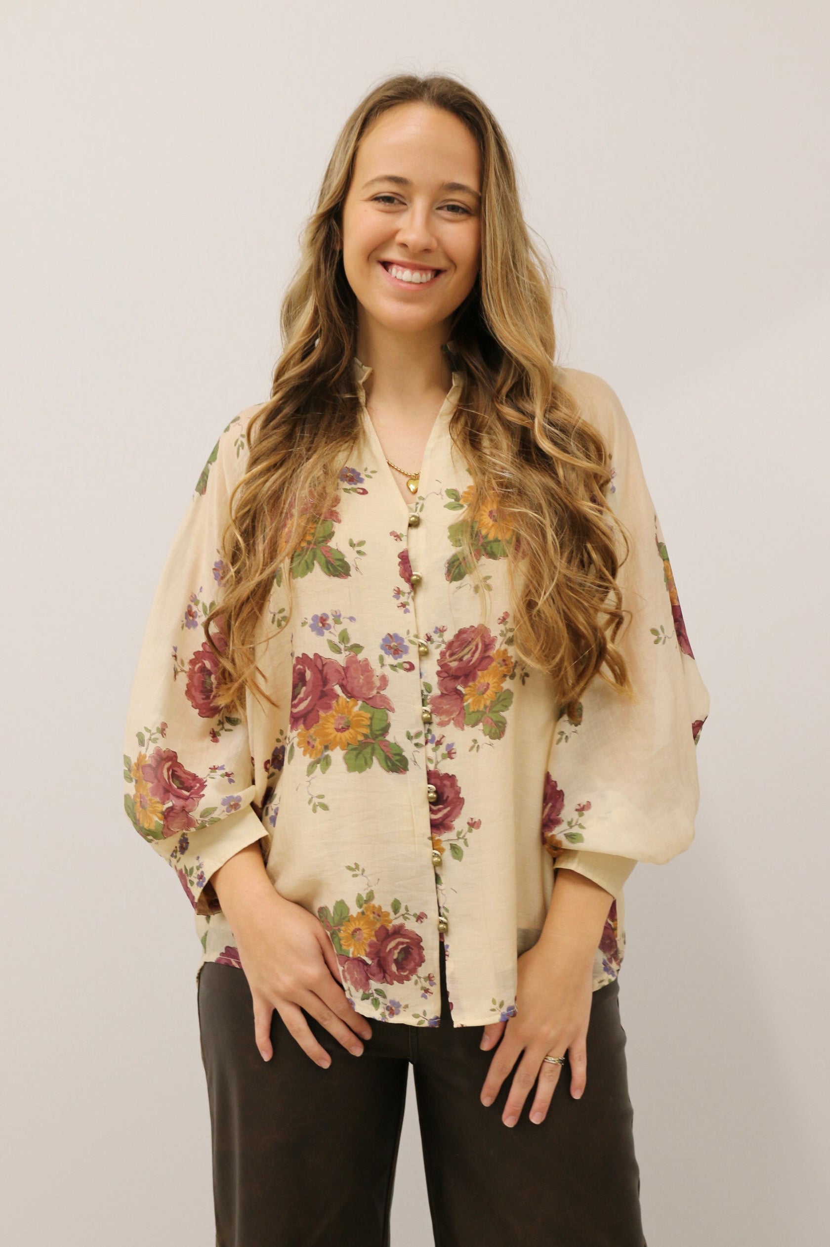 Effortlessly feminine and endlessly versatile, the Nara Button Front Floral Print Top brings a touch of romance to your everyday wardrobe. Featuring a delicate floral pattern in soft, neutral hues, this lightweight woven blouse drapes beautifully for a flattering silhouette. The ruffled band collar and button-front detail lend a timeless charm, while the subtle puff sleeves add just the right amount of volume for a graceful, elevated look.
