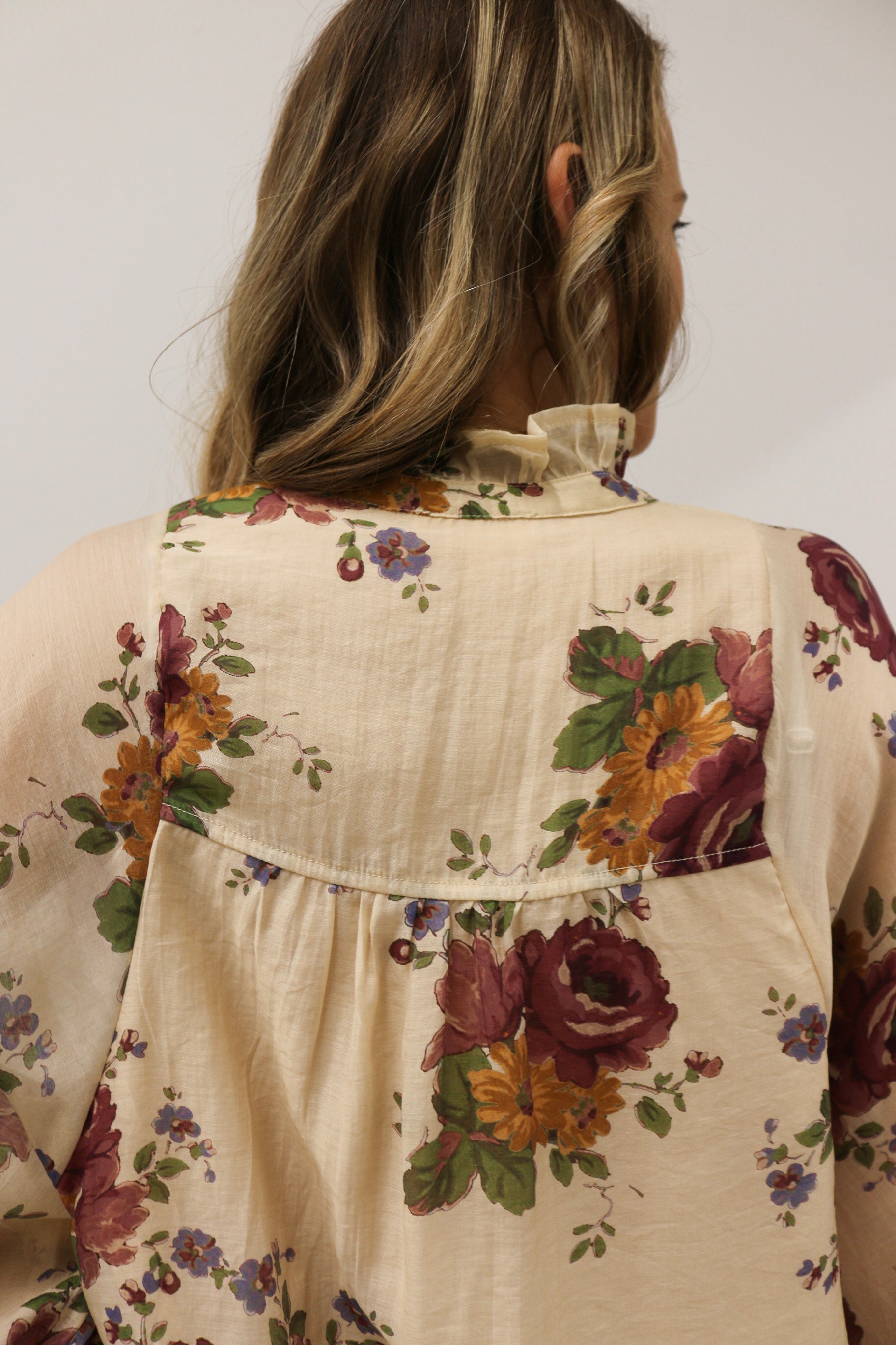 Nara Button Front Floral Print Long Sleeve Woven Top - Ecru Multi
