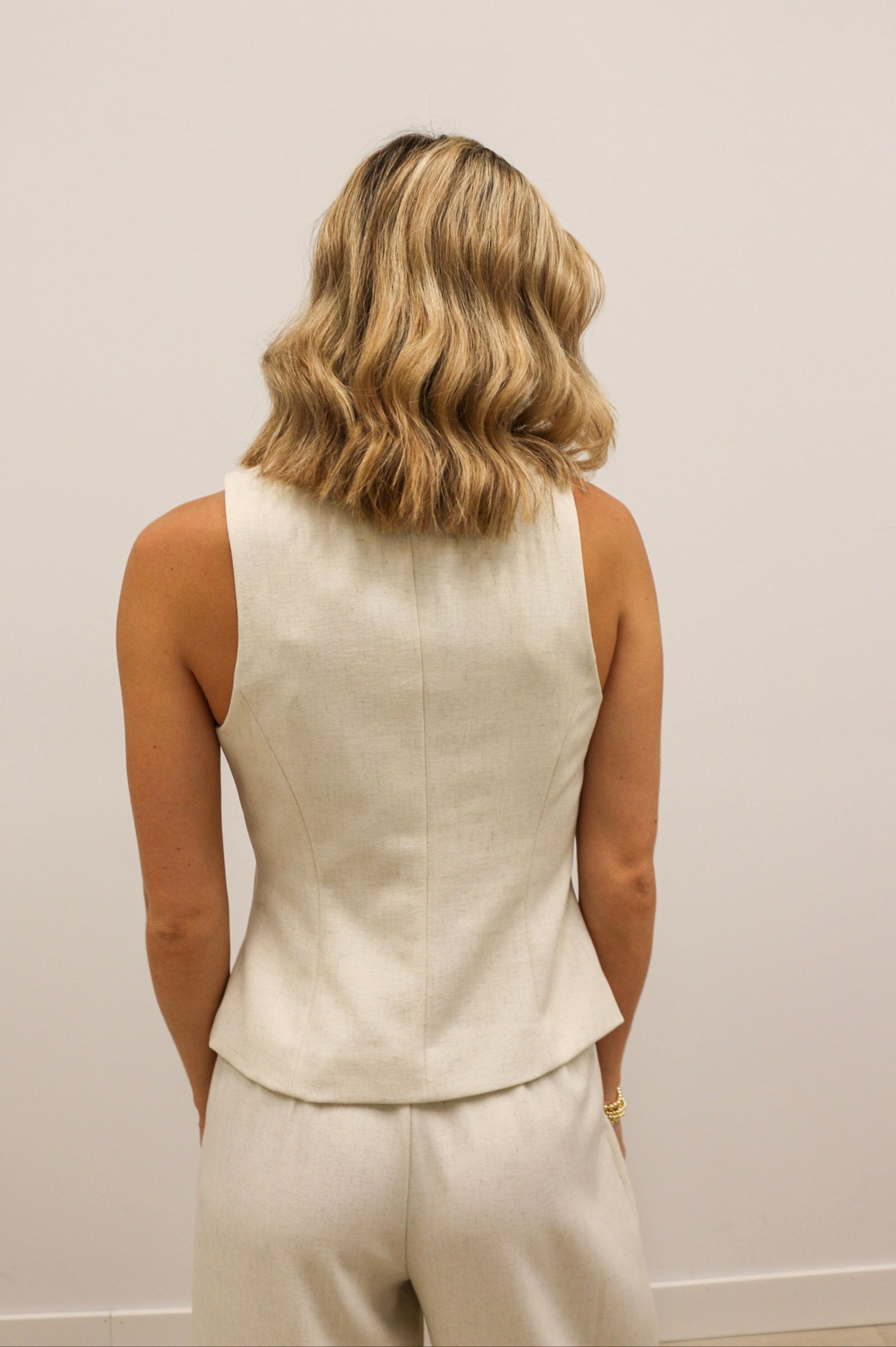 Embrace effortless elegance with our Paige linen set featuring a tailored button closure vest and high-waisted wide leg pants with distinctive pintuck waist detailing. Perfect for summer, this versatile duo transitions seamlessly from vacation to office. Wear together for a coordinated look or separately to maximize your wardrobe options. The breathable linen fabric ensures comfort while maintaining a polished, sophisticated appearance.