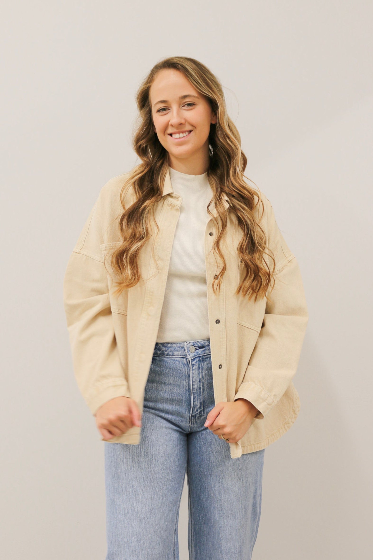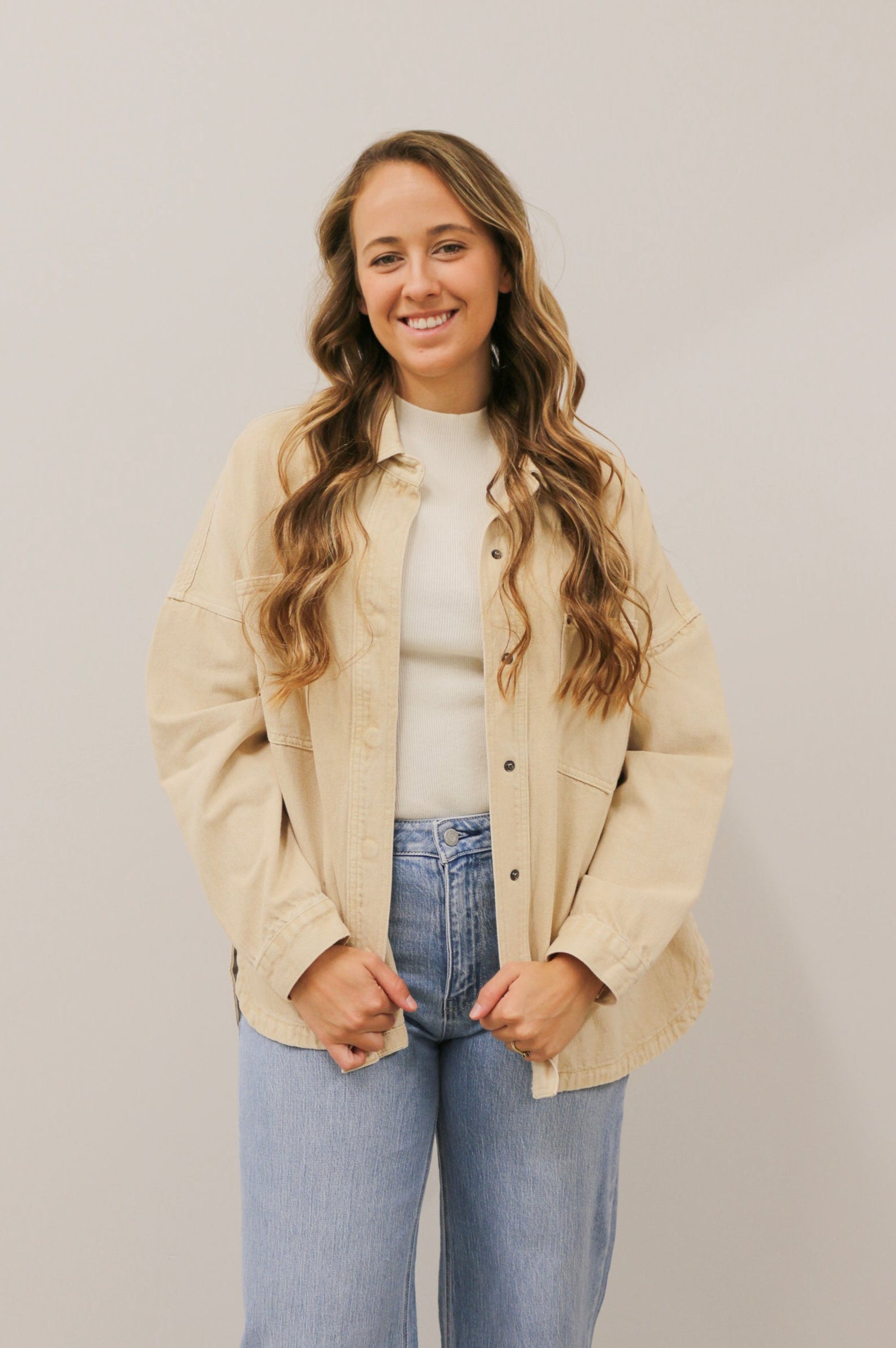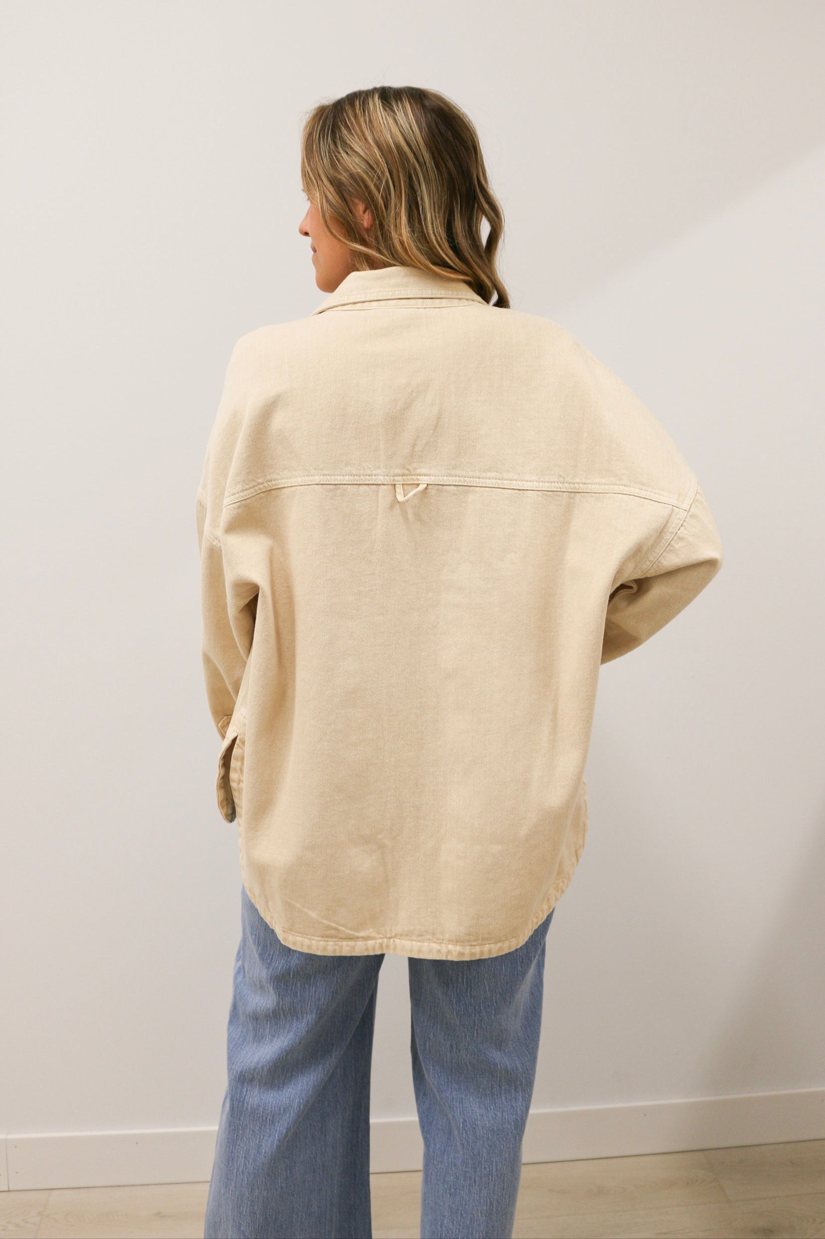 A modern take on a timeless essential, this Oversized Washed Denim Jacket in soft beige brings effortless edge to any outfit. Designed with a relaxed fit and snap button closures, it's your go-to outer layer for transitional weather and laid-back styling. The washed denim finish adds a lived-in look and feel, while the neutral tone keeps it endlessly versatile. Wear it over a fitted dress, casual tee, or layered knits—this jacket does it all, season after season.