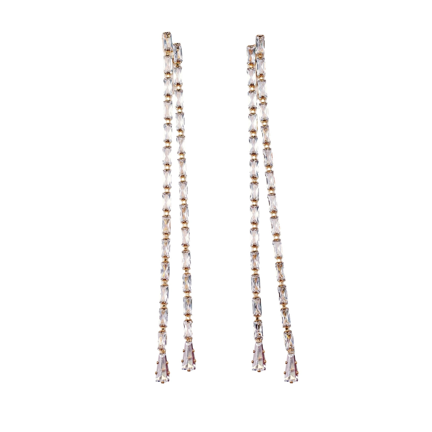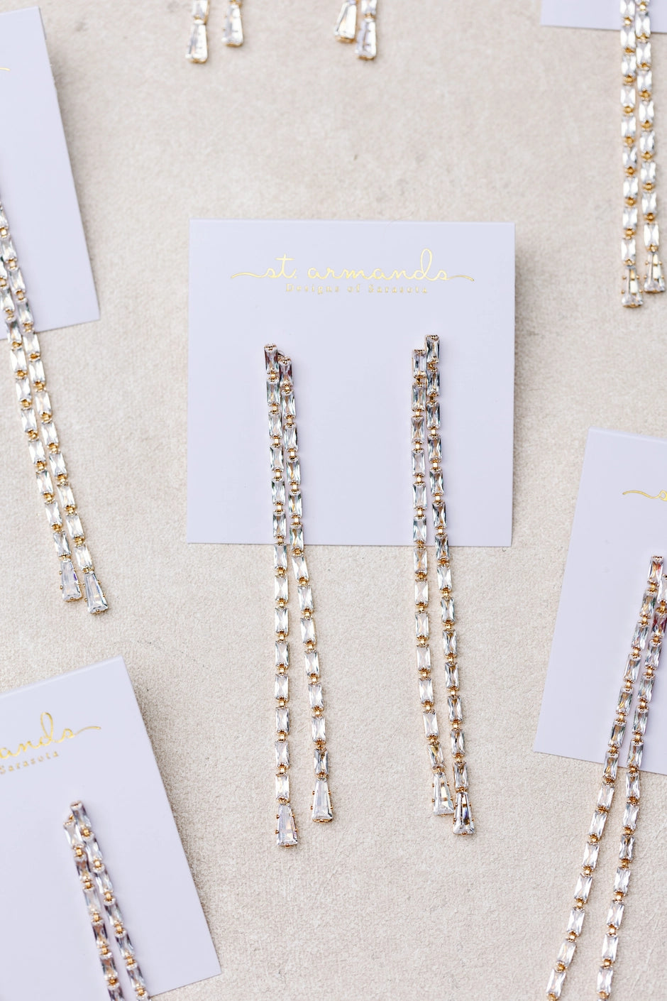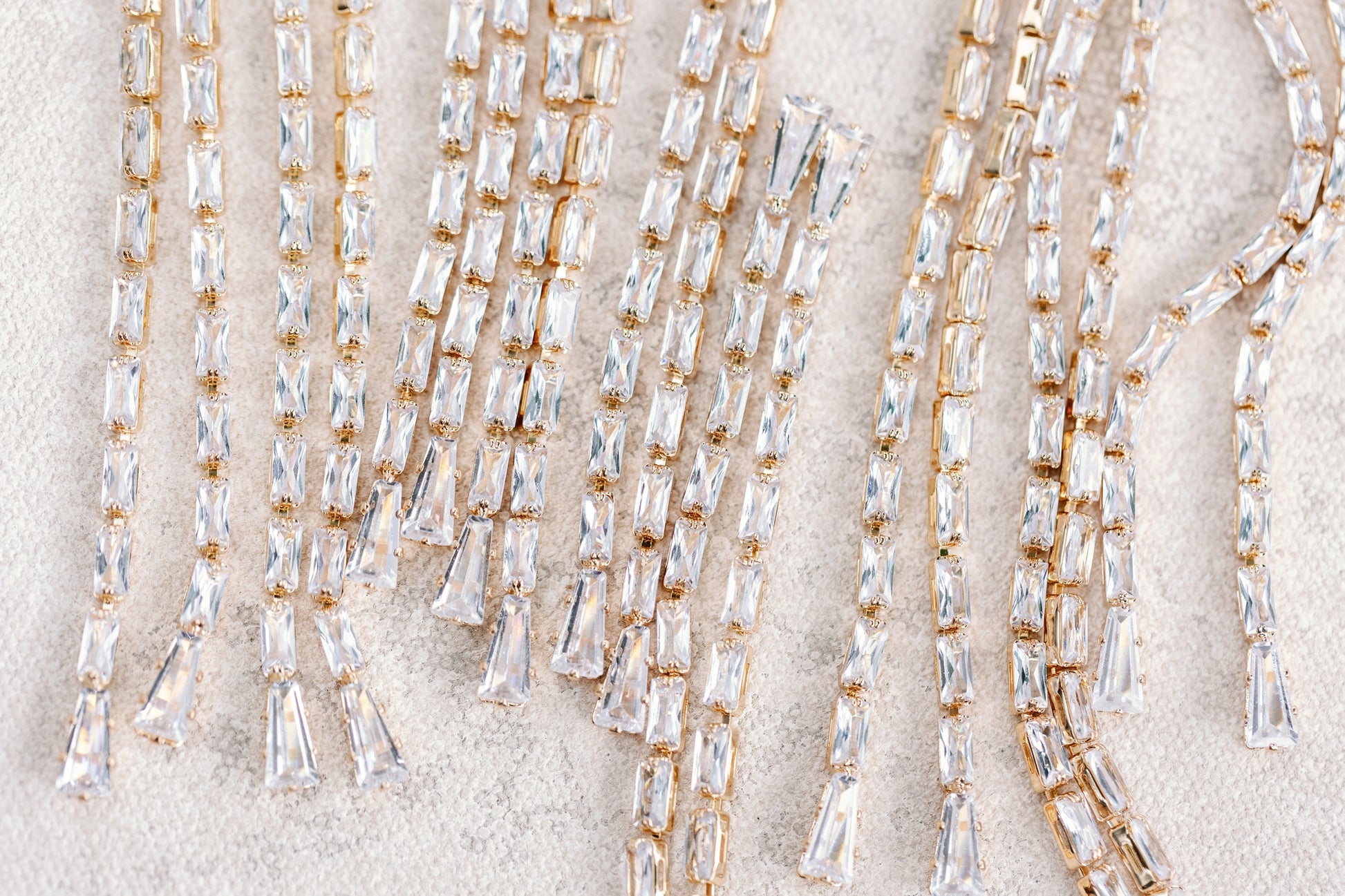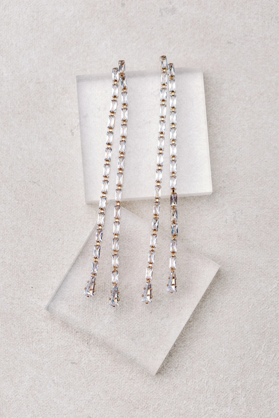 These elegant diamond tennis style duster statement earrings feature two interlocking strands that swing gracefully with every movement. These sophisticated earrings add a touch of glamour to any outfit, perfect for the holidays, weddings and special occasions!
