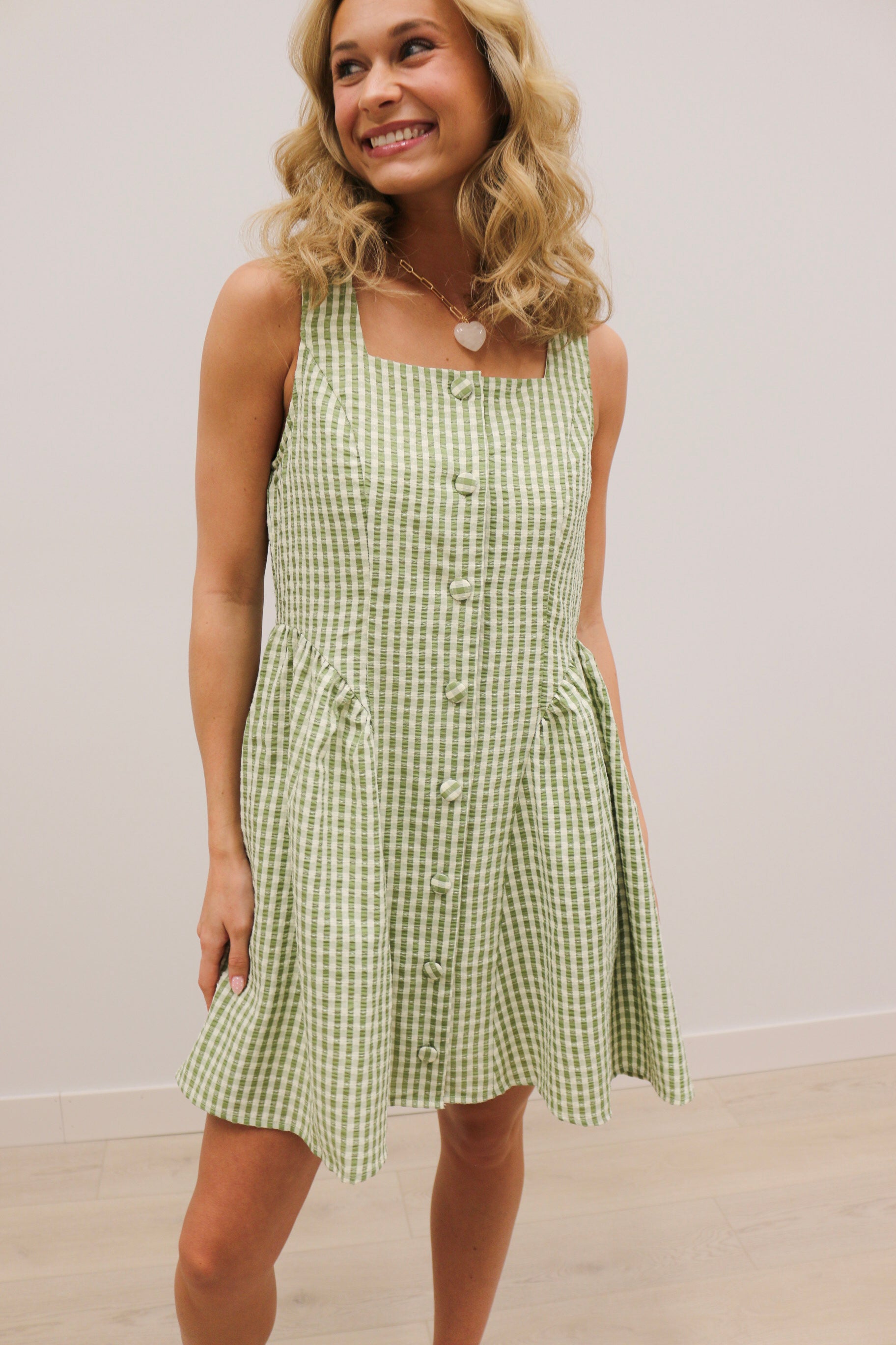 Sydney Button Front Gingham Print Sleeveless Mini Dress - Matcha Green
