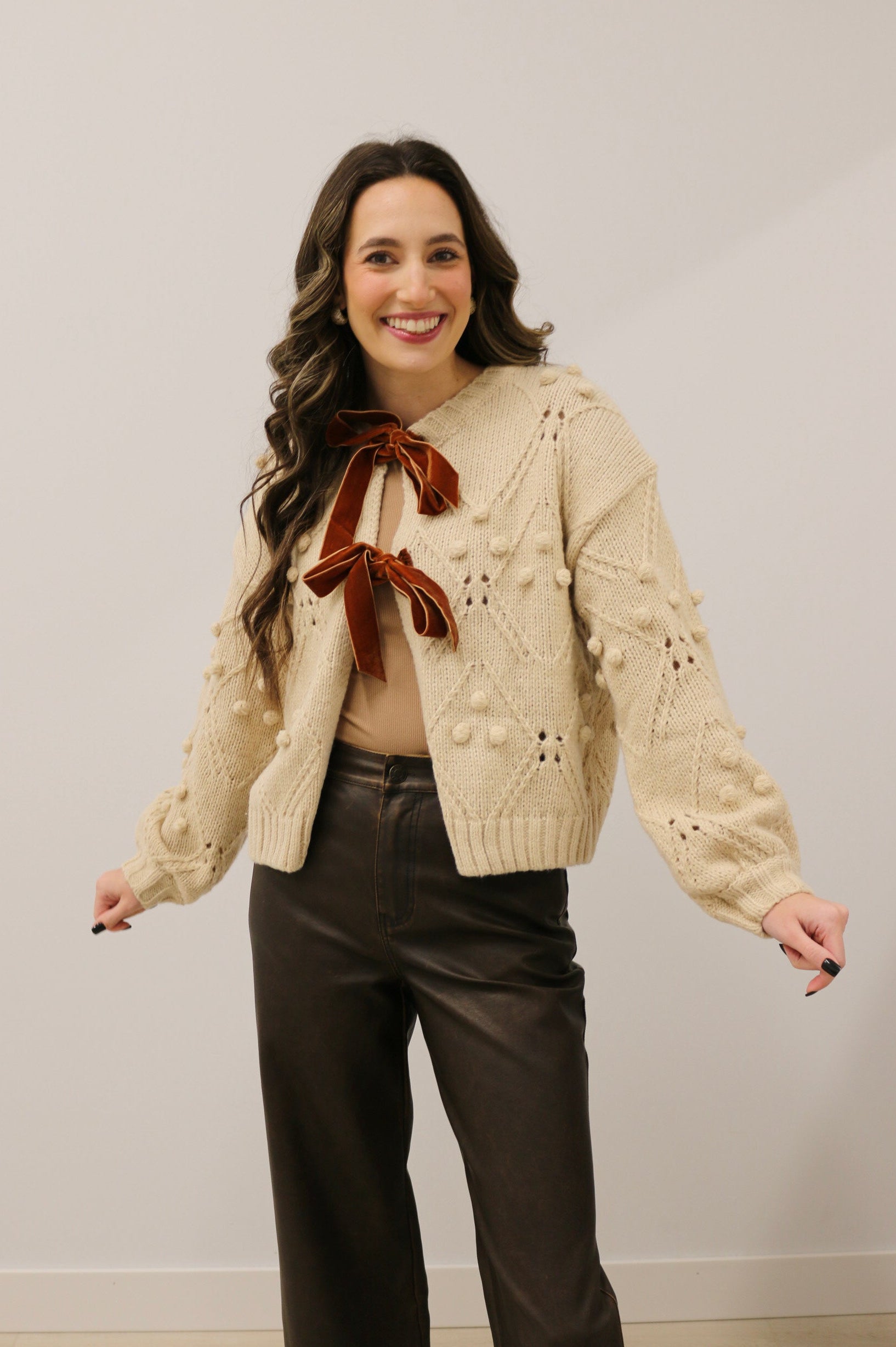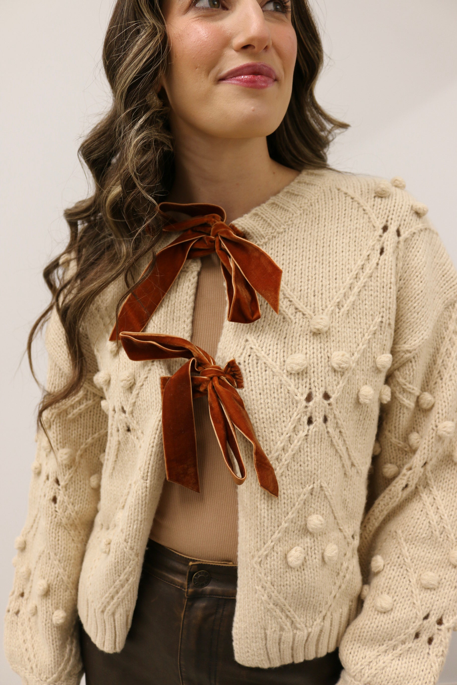 Soft, feminine, and effortlessly chic, the Tanner Stitched Cardigan with Velvet Bow Front is the perfect layering piece for the season. Designed in a beautifully textured open knit, this cardigan blends cozy comfort with refined charm. The brown velvet bow tie closures add a touch of luxe detail, making it the ideal piece to carry you from Thanksgiving gatherings to festive holiday soirées with ease.