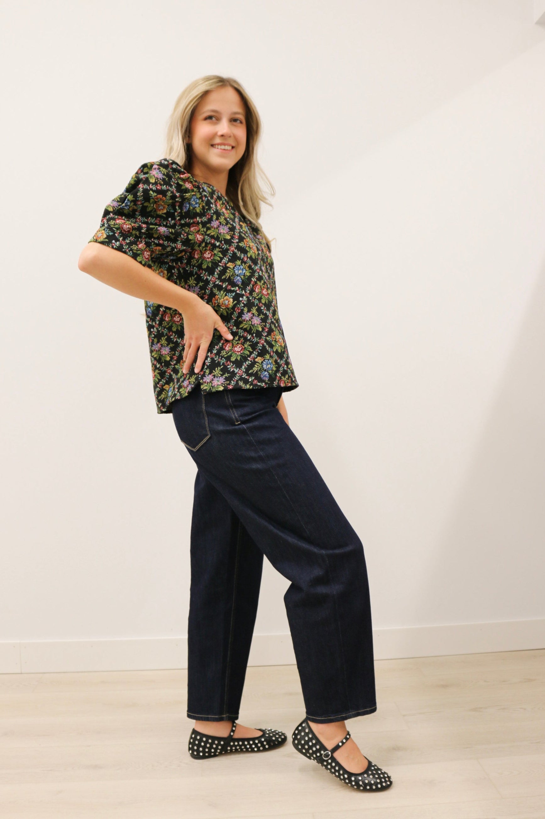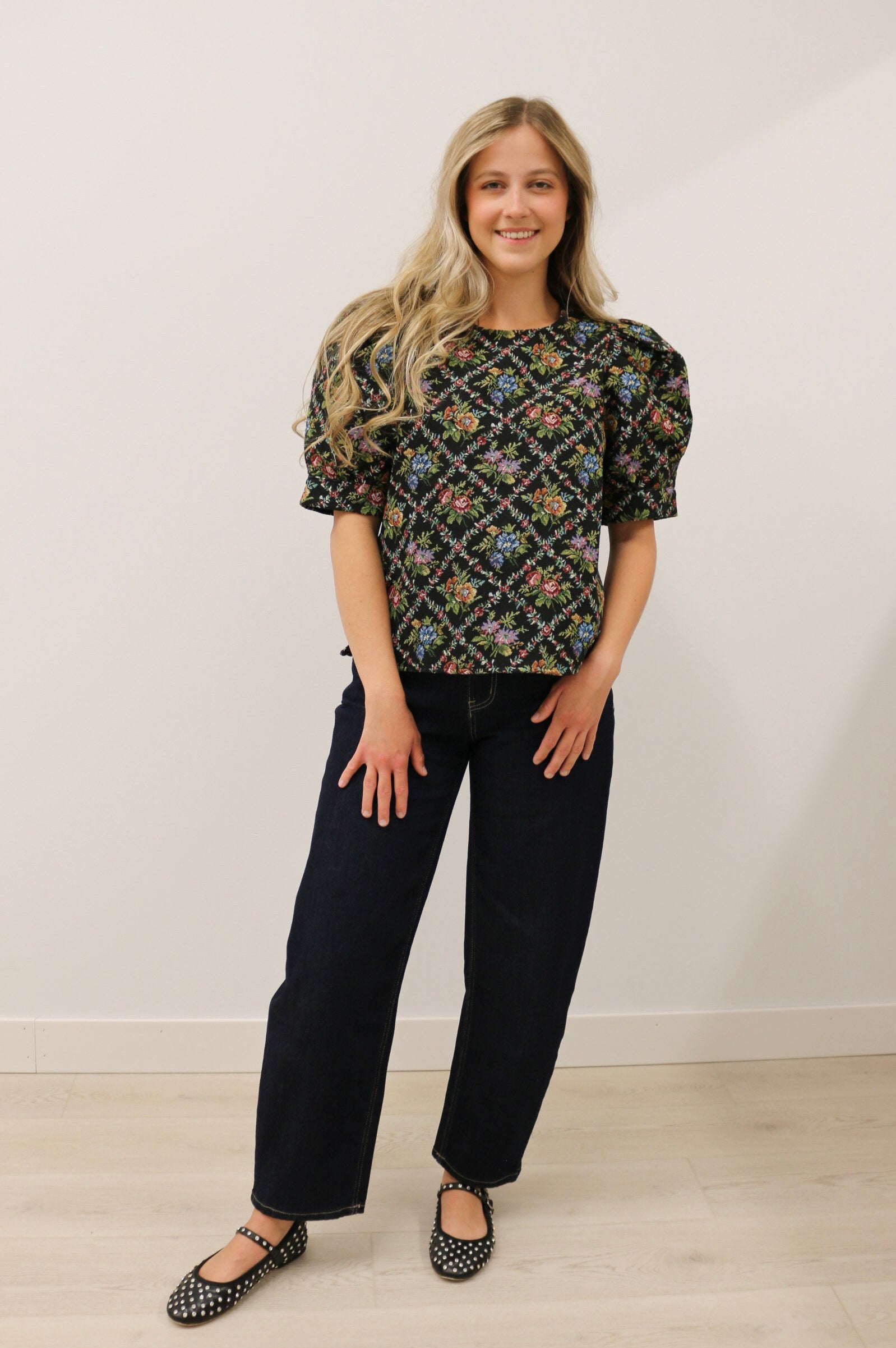 Romantic and richly detailed, the Tapestry Blouse brings a touch of vintage charm to modern silhouettes. Featuring an intricate botanical jacquard design in a striking black multi-tone palette, this puff-sleeve blouse is equal parts statement and staple.