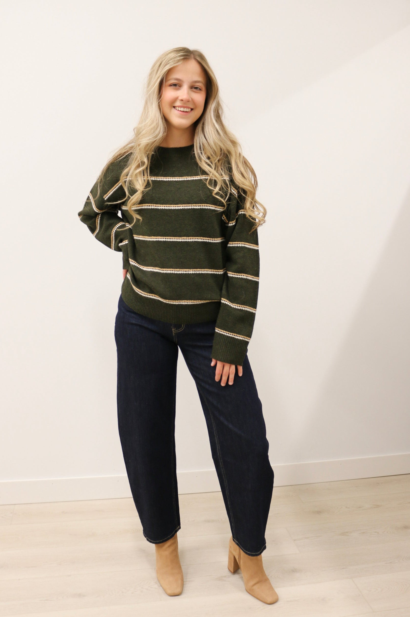 Casual, cozy, and effortlessly refined- the Tessa Sweater is a lightweight essential with timeless appeal. Crafted in a soft olive knit, this long sleeve pullover features subtle embroidered stripe detailing in warm camel and creamy white tones, adding texture and charm. With its classic crew neckline and relaxed silhouette, it’s the kind of throw-on-and-go piece you’ll wear from early fall through spring. Perfect with denim, layered under jackets, or half-tucked into trousers for easy polish.